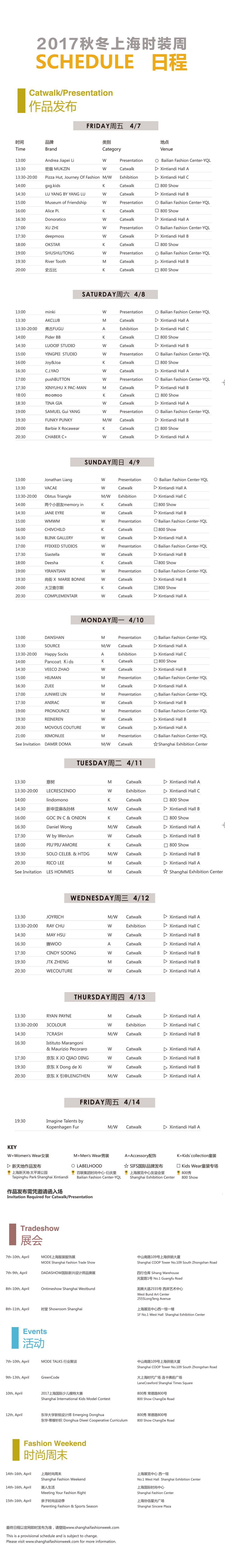 作为中国乃至亚洲最受瞩目的时尚盛会,2017 秋冬上海时装周将以 “诗意科技” 为主题,汇聚国内外优秀的时装设计佳作以及诸多颇具创意的展览活动,于 4 月 7 日至 14 日精彩上演。除了传统的新天地太平湖 A、B 秀场外,本季更全新推出 C 秀场,以充满创意的展览形式来对时装、配饰等不同品类进行展示。LABELHOOD、KIDS WEAR 童装专场、GreenCode、MODE、Ontimeshow、时堂等分会场也将带来各自不同的精彩时尚创意。以下为完整活动日程,感兴趣的朋友请留意各秀场时间。