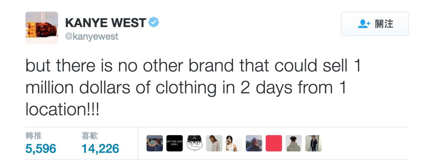 日前,Kanye West 在自己的 Twitter 中公布其在 3 月 18 日到 20 日营业的 Pablo 限定店营业额竟达到惊人的 100 万美元,再一次向我们证明了他在音乐与时尚上的影响力。