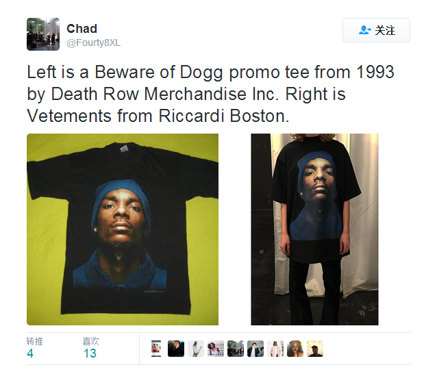 Vetements 继 DHL Tee 之后又带来一款天价单品,却被 Twitter 用户指出与 1993 Beware Of Dogg 巡演系列周边十分相似。