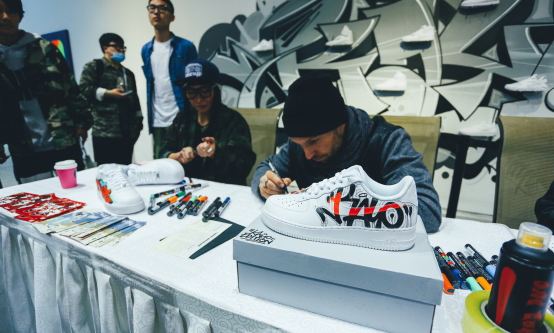 内场,国内知名球鞋店铺 DEAL 亲力打造 “一日球鞋店铺” 由球鞋集合展、现场球鞋发售、现场球鞋艺术改装三个环节组成:其中球鞋展环节别出心裁的运用了涂鸦展墙,创纪录的展出了90款经典喷泡鞋款及多款纯白球鞋;现场抽签发售了 Nike Free Mercurial Superfly “All White”/Nike Free Mercurial Superfly “Black”/Air Jordan 10 “Chicago Flag”/Nike Air More Uptempo “Varsity Red”四个鞋款。同时邀请 GOES、SHIRO、KAYO、ANTZ 四位艺术家对经典的纯白 air force 进行改制。