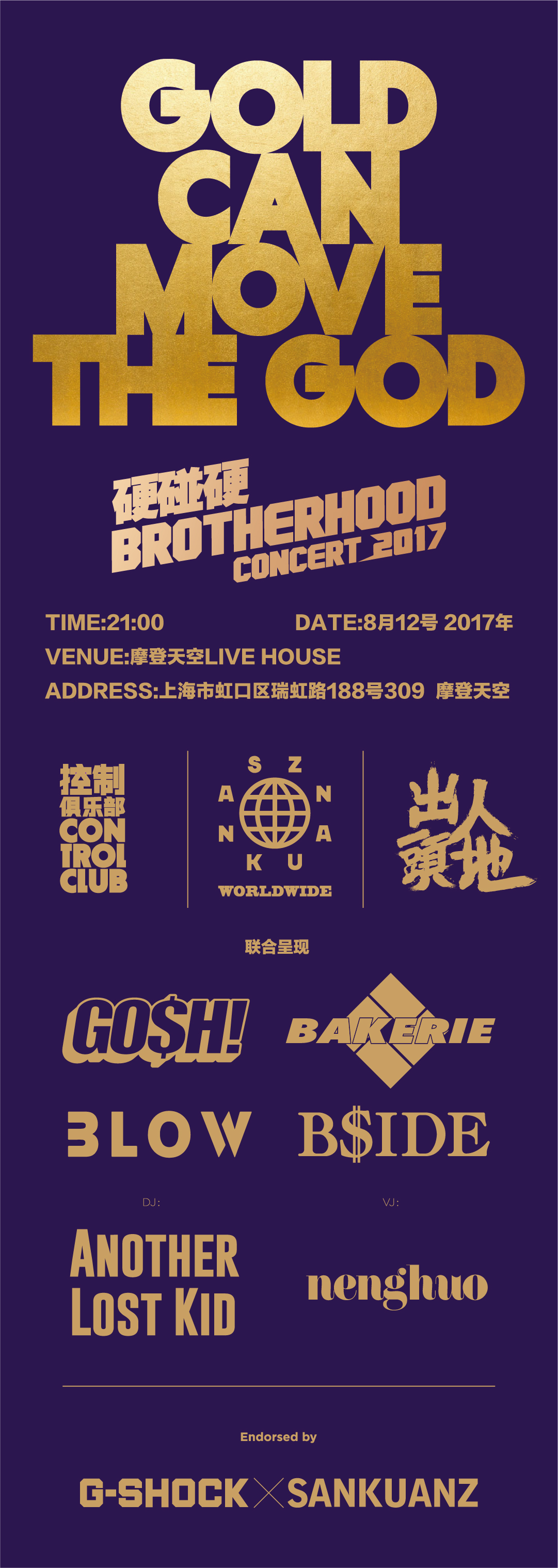 事情是这样的,伴随着 8 月 12 号 G-SHOCK 与 SANKUANZ 合作腕表的上海发布会之后, G-SHOCK 决定再追加举办一场硬碰硬 BROTHERHOOD 音乐会,同样由上官喆操刀制作,并找来艺术厂牌 “控制俱乐部” 与 Hip-Hop 平台 “出人头地” 联合举办。