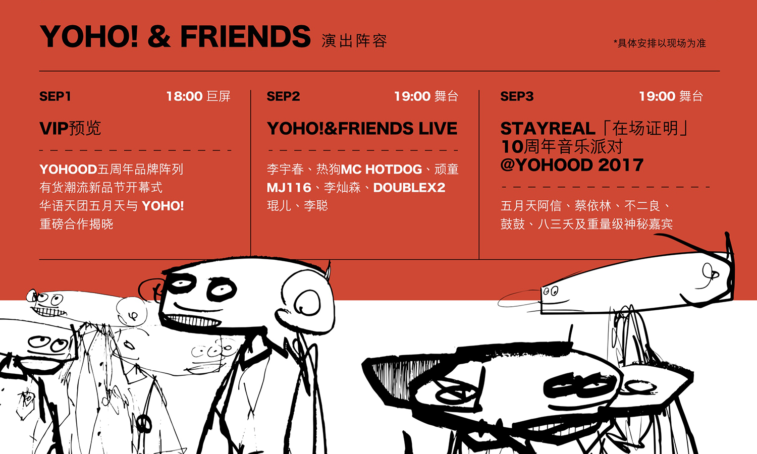今年 YOHOOD 2017全球潮流嘉年华暨有货潮流新品节还在 9 月 2 日和 3 日两天准备了两场演唱会,2 号的“YOHO! & FRINEDS LIVE”请来了李宇春/热狗/顽童 MJ116/李灿森等等歌手演出,而 3 号的“STAYREAL 在场证明 10 周年音乐派对”更有五月天、蔡依林以及重量级神秘嘉宾等等歌手坐阵现场。