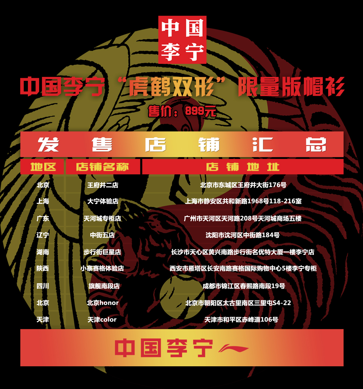 万众期待之余,李宁终于公布了这款虎鹤双形限量版卫衣的发售信息,即将在 3 月 11 日上午 11:00 正式开售。既然是潮流与运动的结合,所以虎鹤双形限定卫衣不但会登陆北京、上海、广州、沈阳、长沙、西安和成都的指定李宁门店,潮流名所北京 Honor 以及天津 Color 也会上架,具体发售地址如下图所示,各位务必提前做好准备,切勿错过!