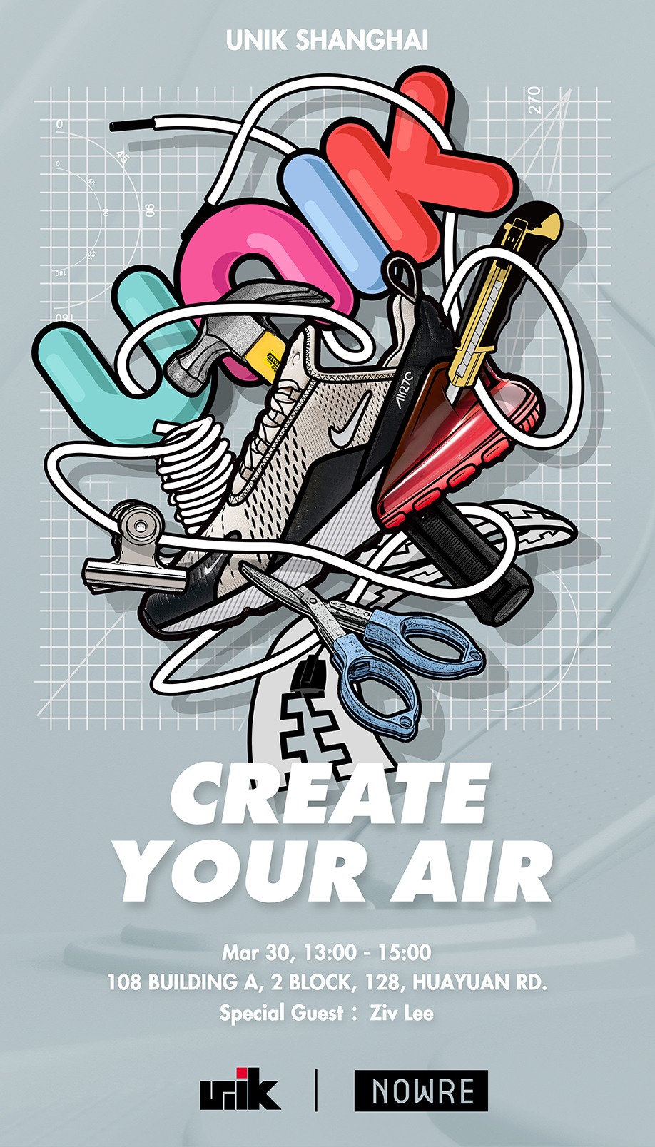 那么重点来了,怎样才能参与本次 “Create Your Air” 主题活动?NOWRE 将与 UNIK Shanghai 联合抽取十名 VIP,按照以下方式参与,就有机会到现场与 Ziv Lee 一起定制属于自己的 Air Max: