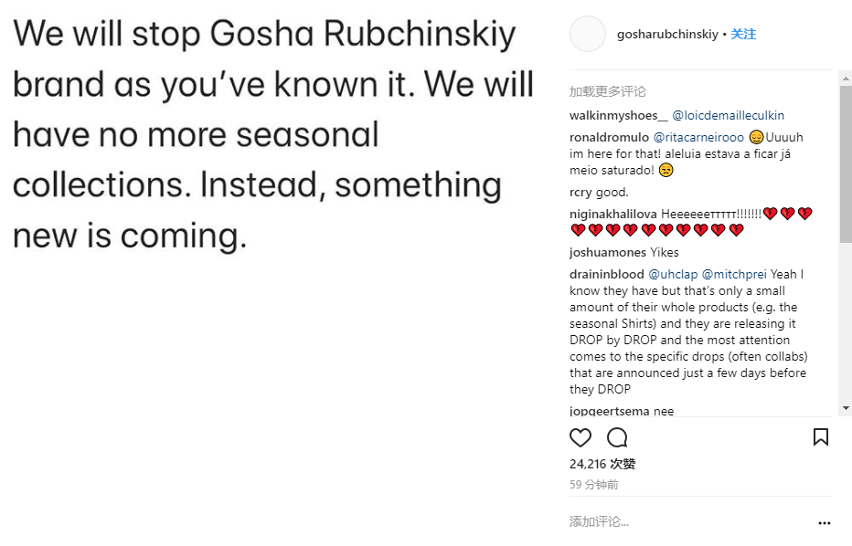 没错,一个惊天的噩耗就这么突然传来,没有一点点防备… Gosha Rubchinskiy 在 Instagram 上宣布将会终止自己的同名品牌,原话为:“将不会再继续发布季节性单品,取而代之将会有一些新东西出现。” 据称他是疲于制作一季又一季的设计,接下来可能会投入更多精力到旗下的滑板品牌 PACCBET 或者有可能推出女装支线,因为他更想做一些项目性的东西,而不是每一季重复地做设计。不过也有可能在不做季节性单品之后,将会随机的发布一些单品,我们也只能抱有这样的希望了。