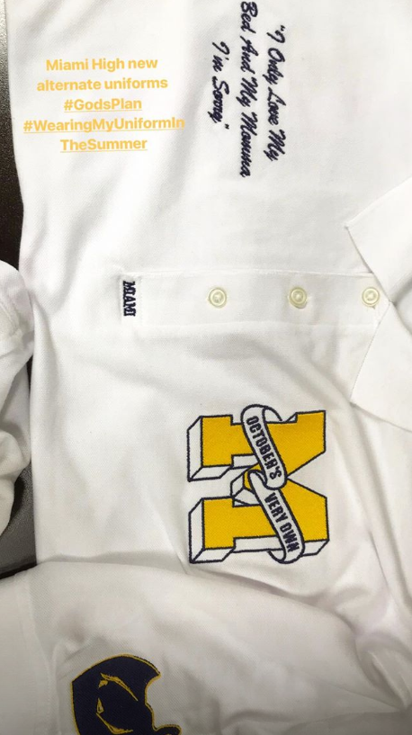 大家还记得《God’s Plan》的 MV 吗?Drake 在迈阿密送出去了一百万美金,还在校园里和学生们一起拍摄,当时他还给迈阿密高中捐赠了 $25000 美元并承诺学生们他将会为他们设计一款校服。日前 Drake 在 Instagram Story 上为我们透露了一下这款校服的成品,纯白色的 Polo 胸前印有 MIAMI、大型的 M 字样以及《God’s Plan》中最经典的歌词:“I only love my bed and my momma, I’m sorry”。大家是不是很羡慕别人家的高中生呢,谁又不想穿一件 Drake 设计的校服呢?
