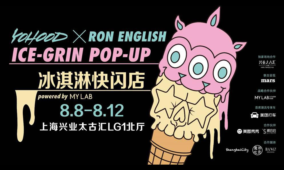 2018 年 8 月 8 日,YOHOOD 2018 ”全球潮流嘉年华“ 门票正式开售,作为一年一度全球顶尖的潮流盛事之一,此次 YOHOOD 携手 RON ENGLISH 进行深度合作,不仅仅设计了今年活动的主视觉,还结合其独特的设计元素,倾情打造线下冰淇淋快闪店 —— ICE-GRIN POP-UP ,于 8 月 8 日至 8 月 12 日强势登陆上海兴业太古汇,在这 5 天里,你将体验到视觉与味蕾的双重享受,给上海的 Ron 迷们带来最不一样的艺术视觉体验。