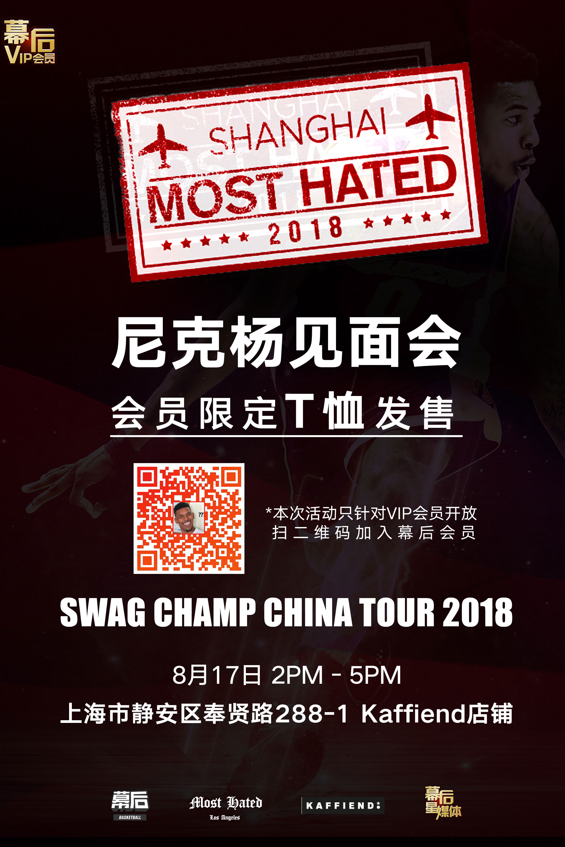 对潮流的热爱致使他推出了自己的品牌 MOST HATED ,和其他潮流品牌一样,MOST HATED 一样不好入手,但近日,可以亲自入手并且能见到 Nick Young 本人的机会就在你眼前,8 月 17日,上海知名潮流店铺 KAFFIEND 联手体育影师平台 ”幕后TV“ 将 Nick Young 邀请到了上海举办 MOST HATED 的 Pop Up Store ,除了有 KAFFIEND 独家售卖的 MOST HATED 限量产品外,Nick Young 更是会亲临现场,很期待吧?想了解活动参与详情的可点击此处查看。