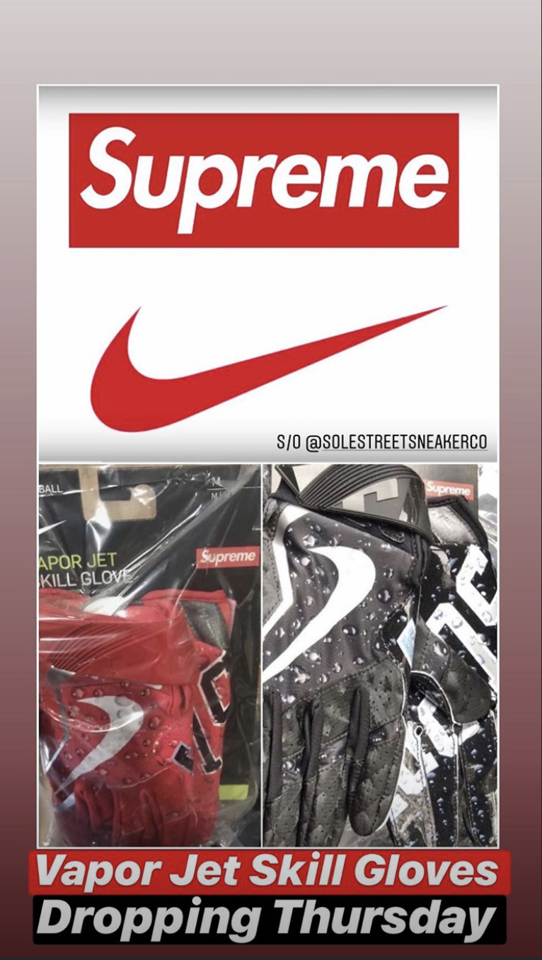 Supreme 2018 秋冬系列的发售已经进入尾声,上周的 Steiff 毛绒玩具熊最具人气,当然炒卖价也一路飙升。今日根据 Instagram 情报账号 @dropsbyjay 的最新消息,Supreme 下周还将带来与 Nike 的联名配件,按照描述这应该是一款美式橄榄球手套,共有黑色及红色两种配色。各位平时喜欢运动的朋友,如果有需要的话可以留意一下了。