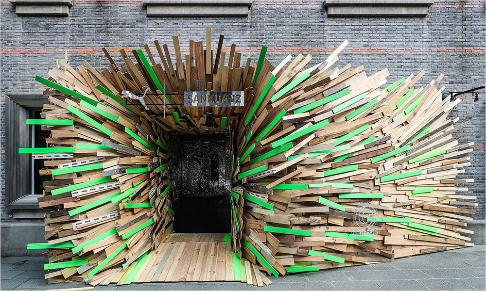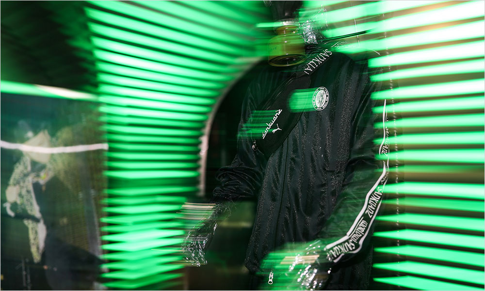 整个活动沿用了 PUMA x SANKUANZ 本季系列 “KILL THE WALL” 的主题,入口处巨大的破洞装置仿若开启了连结不同维度的时空之门,“破墙而入” 的设计既点题主旨,同时亦与 SANKUANZ 品牌致力于打破时装与街头文化、音乐以及艺术等一切边界的品牌理念相契合。身着 PUMA x SANKUANZ 全套鞋服联名系列的三大主题装置《未来机器人》、《潜在吸引》与《自我改变》呈一线排开,形象地阐述了此番双方合作对于青年族群的质变催化效应。本次联名系列的服装部分集功能性与前卫感于一身,采用足球元素的提花织物与颇具科技风的徽标字样混搭。在复古未来主义风格中,绿色和紫色的冲突感强化了复古和科技面料相融合的整体设计理念。