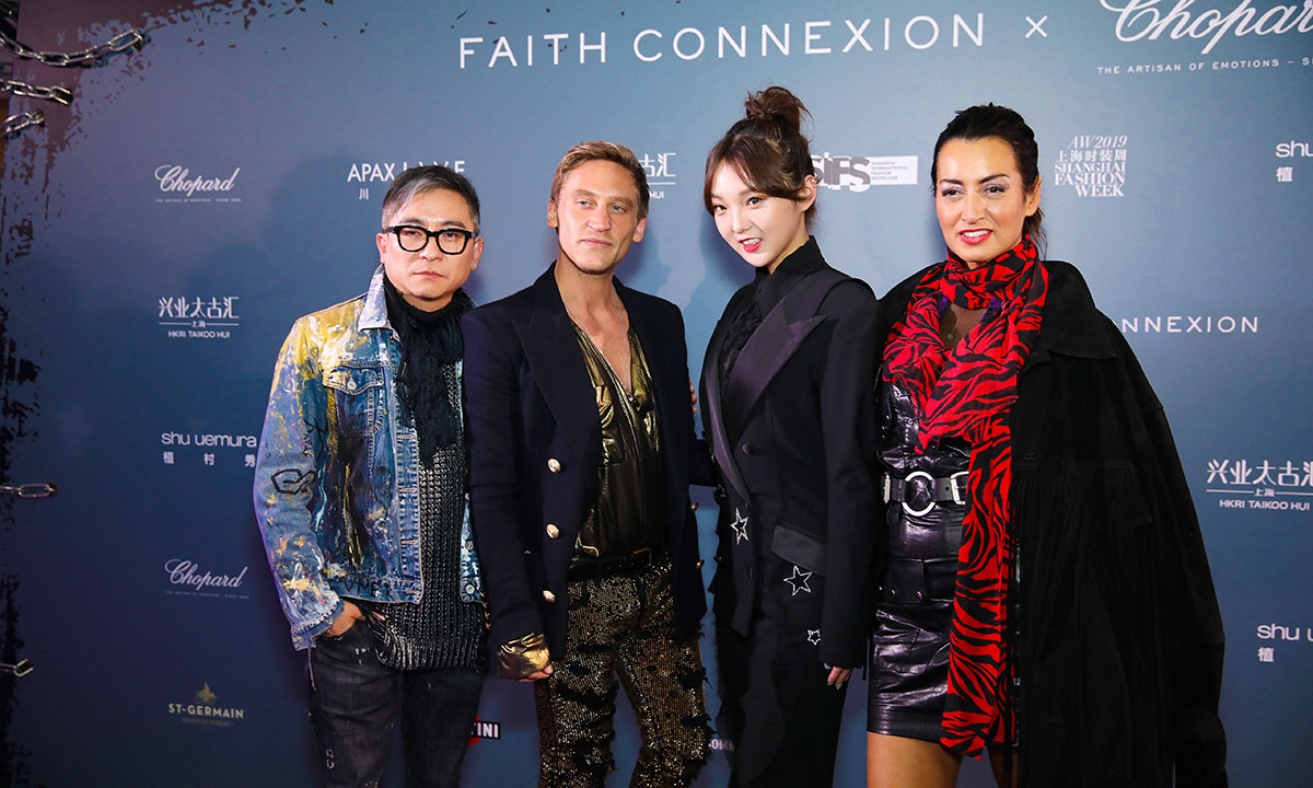 左一:上海时装周 SIFS 国际品牌发布负责人 Terence Chu;右二:国内新声代创作歌手强东玥;右一:FAITH CONNEXION 联合创始人 Maria Buccellati