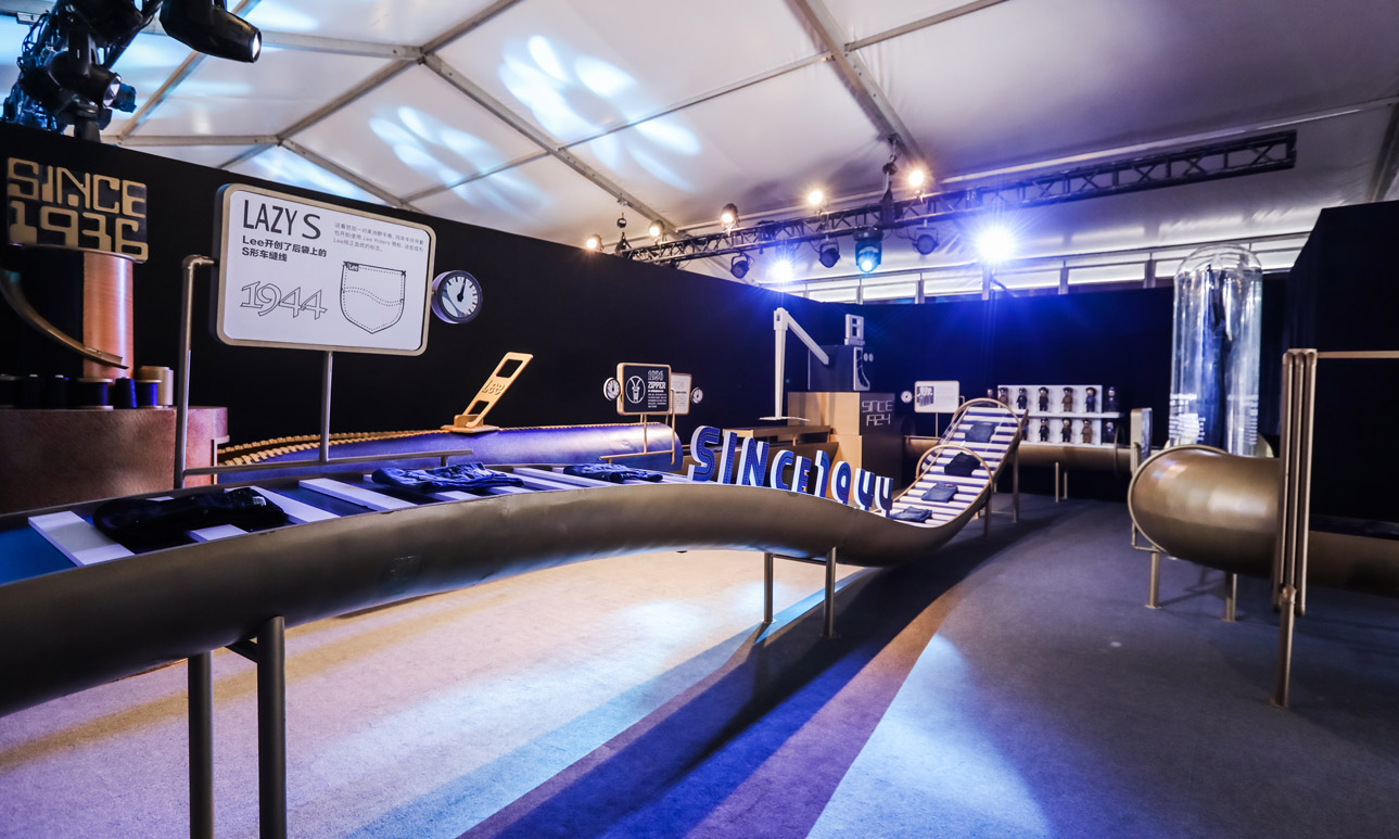 采用黑灰色调的 130 周年历史展示区,整体呈现出浓郁的复古工业风格,令人仿佛置身美国堪萨斯工厂。区域内以传输带和管道的创意形式回顾 Lee 的重要历史节点:1913 年创造第一款连体工装裤;1924 年引进 13 安士重磅丹宁布制作经典 101 系列;1936 年和 1944 年著名的马毛皮牌与 Lazy S 车缝线分别成为 Lee 纯正血统的标志;2016 年 Lee 使用创新科技面料的精玉透凉系列荣获爱迪生铜奖……对于具有创新进取精神的 Lee 来说,突破的脚步从未停歇。现场观众不仅可以深入了解 Lee 建立在风格之上的牛仔文化,还可通过关注 Lee 官方微信公众号,获取极具特色的纪念贴纸,打卡 Lee 130 周年特别时刻。