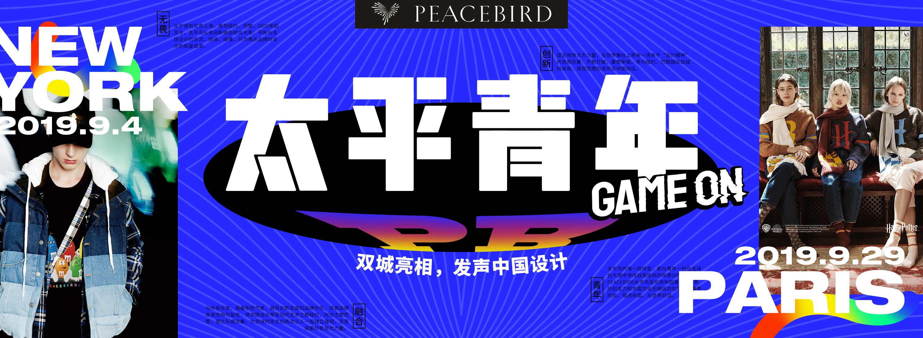 中国时尚服饰风向标品牌太平鸟正式宣布,将于 2019 年 9 月期间以 “太平青年 GAME ON” 为主题强势登陆纽约时装周及巴黎时装周。届时,在 “艺术之都” 纽约及 “梦想之都” 巴黎,源于中国设计的潮流美学将相继实力上演。这是太平鸟继 2018 年及 2019 年初亮相纽约时装周后,再次传递无畏、创新、青年、融合等四大设计主张,并借此表达在国际融合背景下,中国设计力量不断和全球的设计力量交流、链接和创新,用中国青年无边界的创造力和中国文化无隔阂的包容性去描述中国,和世界对话。