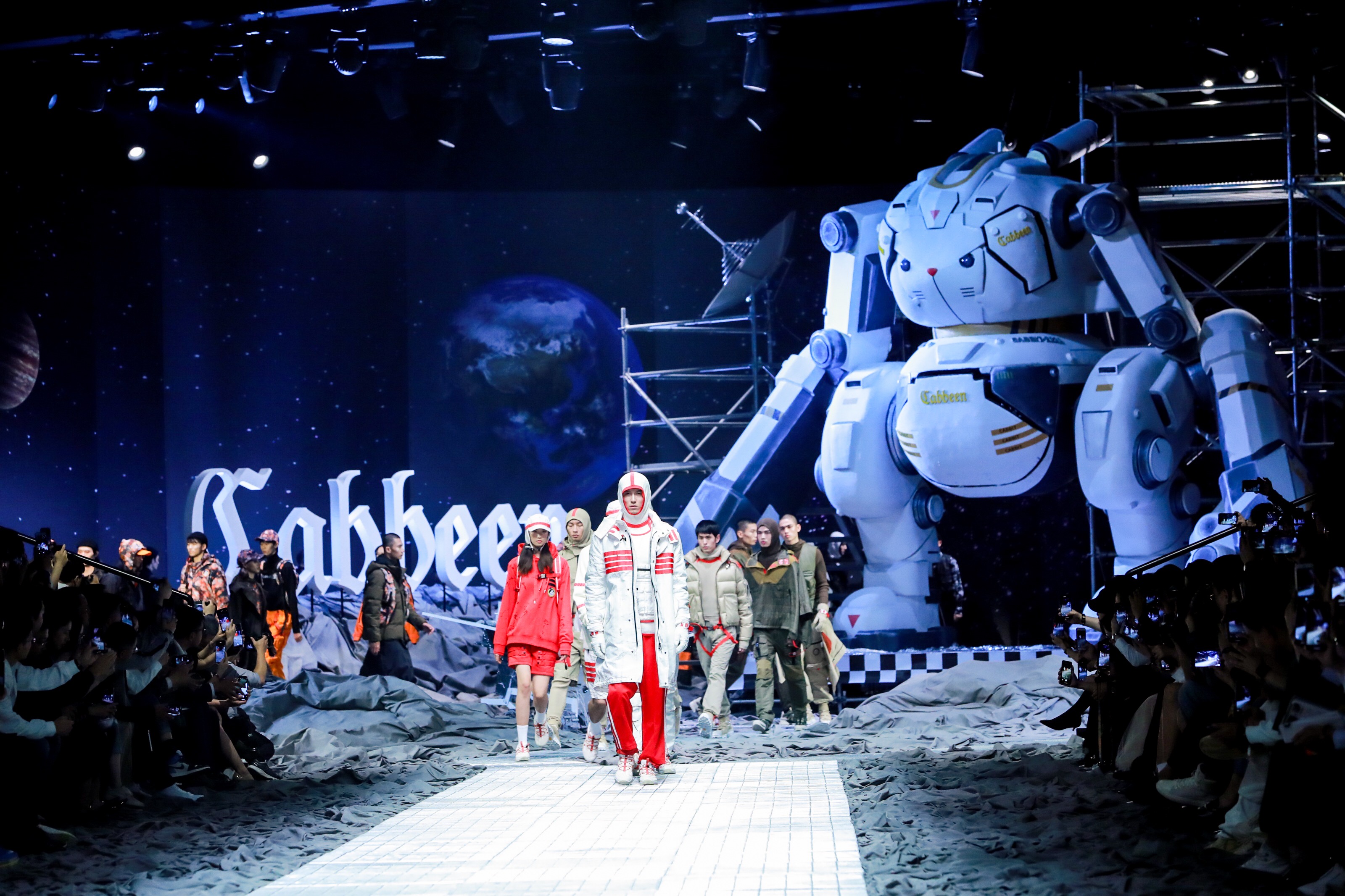 近日,上海时装周闭幕大秀在一派科幻与先锋的氛围中瞩目上演,中国男装设计师品牌 Cabbeen 卡宾,在 Cabbeen 卡宾服饰主理人、中国著名设计师卡宾先生带领下,首度跨界中国航天文化,为观众呈现了一场行走于超时空「月球城」之上的《月兔计划——Cabbeen 卡宾 x 中国航天文化》时装发布盛会,带来以虚拟科幻故事为背景,融合高科技大型展出、互动、影像装置于一体的沉浸式时尚感官体验。发布秀上,人气歌手小鬼王琳凯、先锋电音乐队 TIMERS 献唱, 乐华 NEXT 成员丁泽仁、李权哲、黄新淳也现身助阵。