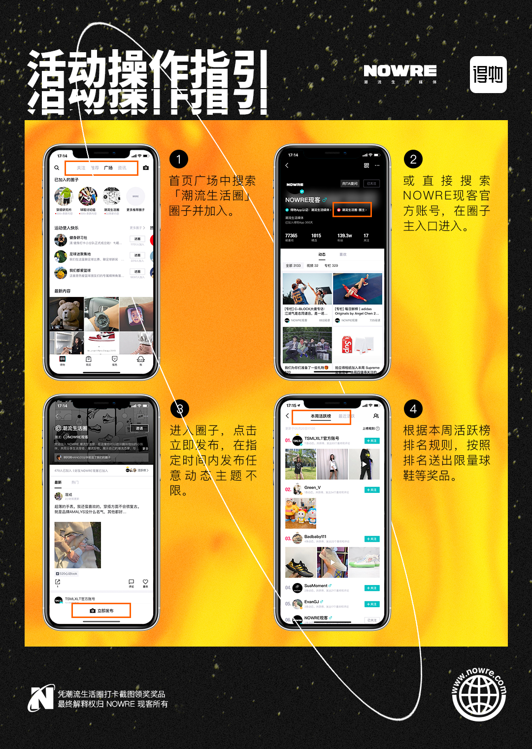 经过 5 月 25 日至 31 日为期一周 的「角逐」过后,NOWRE现客将选出在得物 App「潮流生活圈」本周活跃度排行榜的第 1 至 10 名成为此次「即刻入圈」活动的获奖者,并于三个工作日内在官方微博 @NOWRE现客公布获奖者名单。届时,请获得奖品的「幸运儿」们凭打卡截图添加 NOWRE 官方微信:nowre2017 ,领取您的奖品。