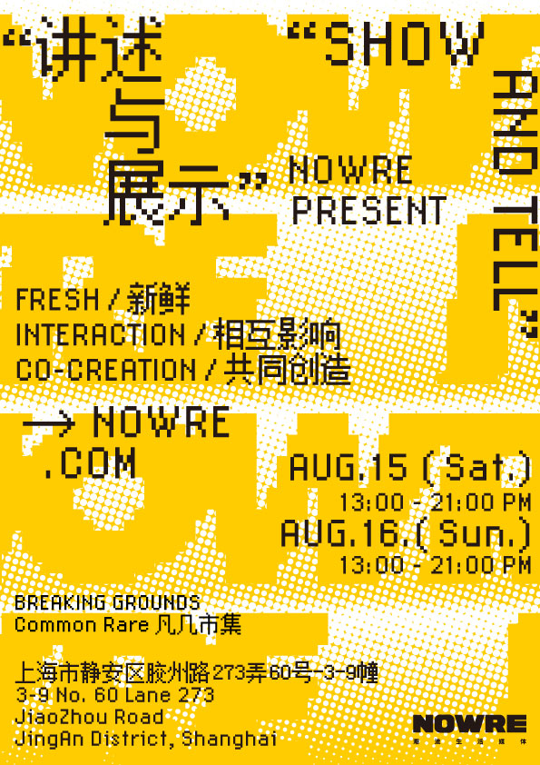 依照惯例,此番 NOWRE现客亦为想要参加这场「SHOW AND TELL」特别活动的朋友们准备了「特别福利」——前往 NOWRE 官方微博 @NOWRE现客参与互动,即有机会获得本次凡几 CommonRare「Breaking Grounds」地下市集的「免费入场券」。想要与 NOWRE现客「面基」、现场感受「内容的力量」的朋友们,我们届时不见不散!