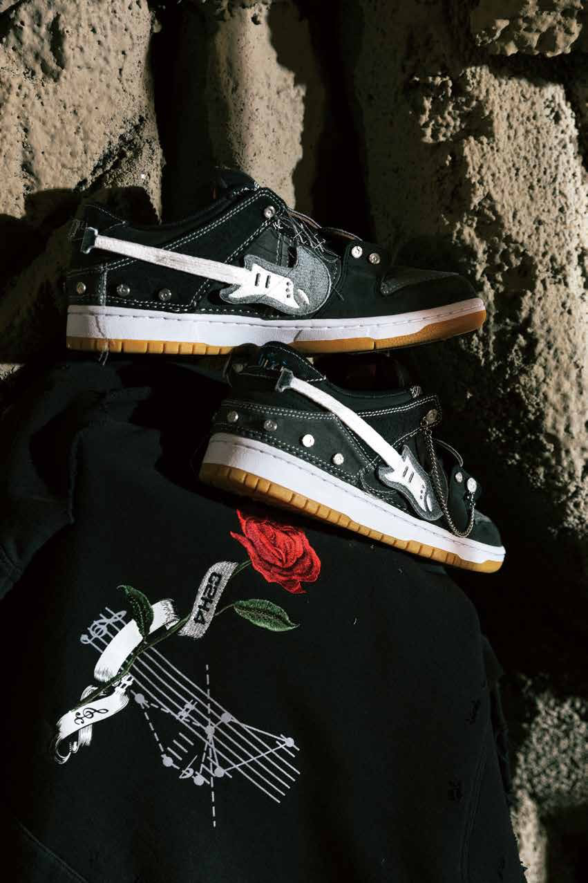 此双客制鞋款注入了大量音乐的元素,包裹鞋面的 Ecco Leather 温感皮和环绕鞋跟的定制五金都是来自 C2H4® 所创造的语言。鞋带孔眼两侧的金属链,鞋侧的吉他刺绣图样及鞋带上的音符徽标都来自于陈以溪对音乐的感知。