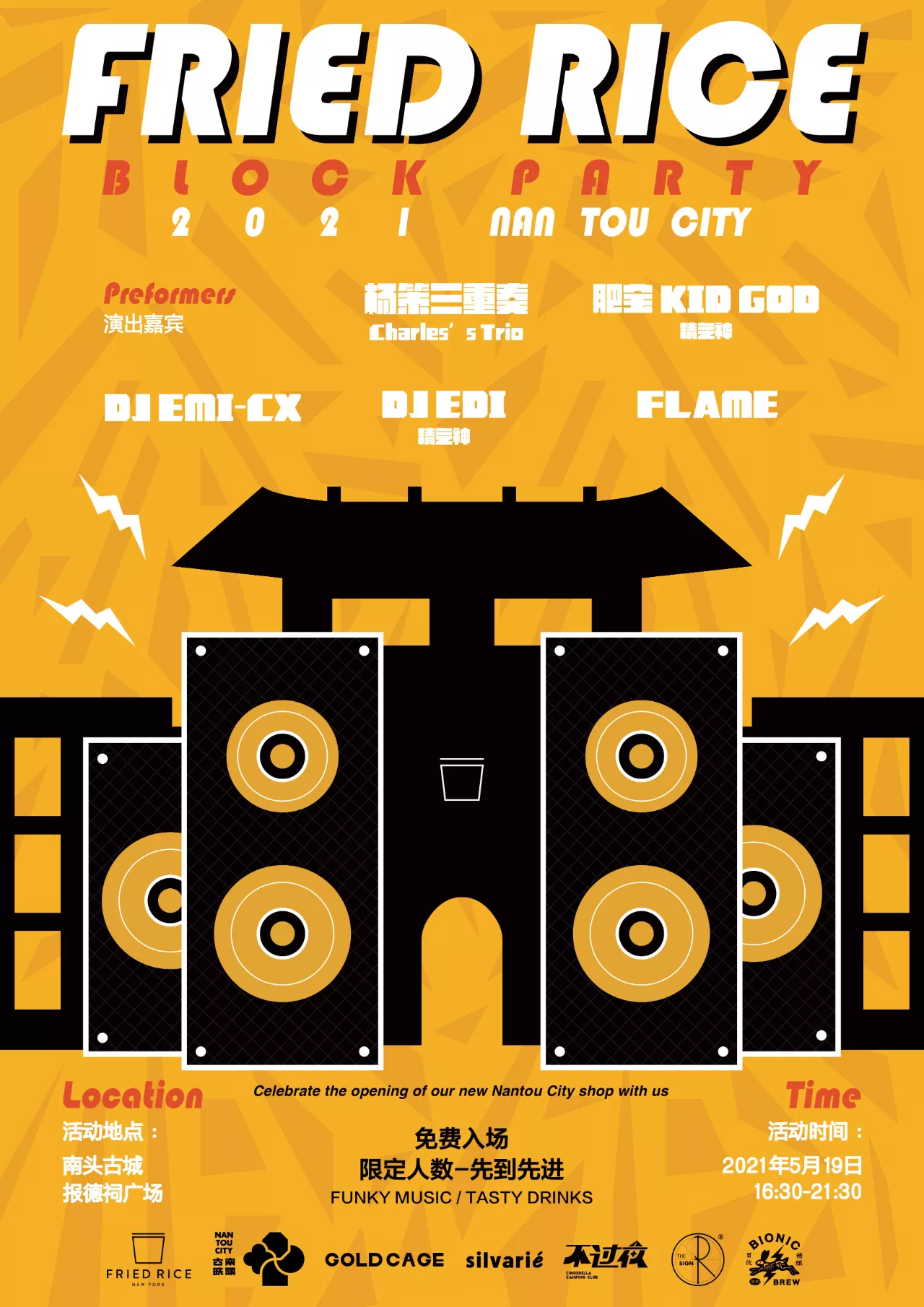 FRIED RICE BLOCK PARTY 2021 街头派对信息: 深圳南头古城中山东街88号楼101号活动时间: 5 月 19 日(周三)16:30-21:30演出时间表 Timeline: DJ EMI-CX 16:30-17:45 FLAME 17:45-18:15 肥宝 KID GOD & DJ EDI 18:30-19:30 杨策三重奏 Charles’s Trio 19:45-21:15