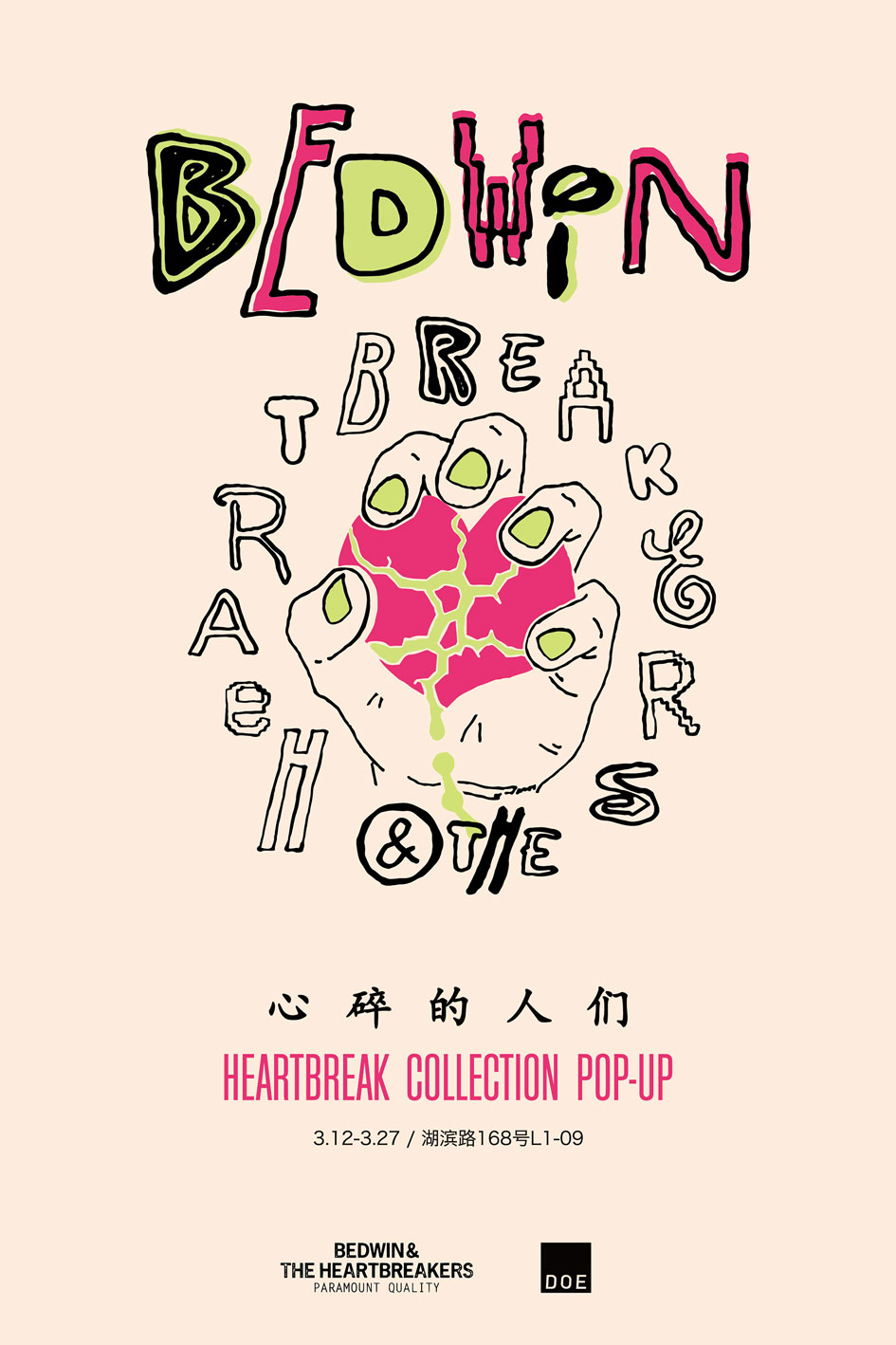 「心碎的人们」主题 Pop-up 将于 3 月 12 日于 DOE 新天地店开幕,持续到 3 月 27 日。BEDWIN & HEARTBREAKERS「HEART BREAK」系列也已于 DOE 官方小程序发售。