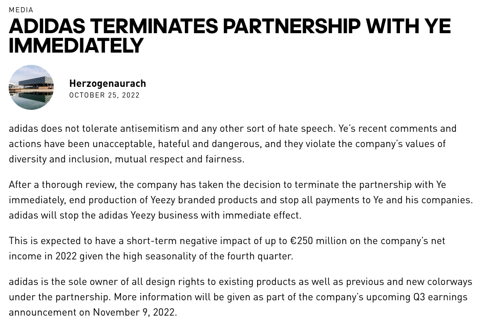 adidas 表示 Ye 的言论是不可接受、充满仇恨、危险的,违反了公司多元化和包容平等的价值观。虽然声明中 adidas 强调了 adidas Yeezy 是设计所有权的拥有者,但 adidas 表示将停止生产 Yeezy 产品,即刻停止 adidas Yeezy 的业务,也不会再向 Ye 和其公司支付款项。