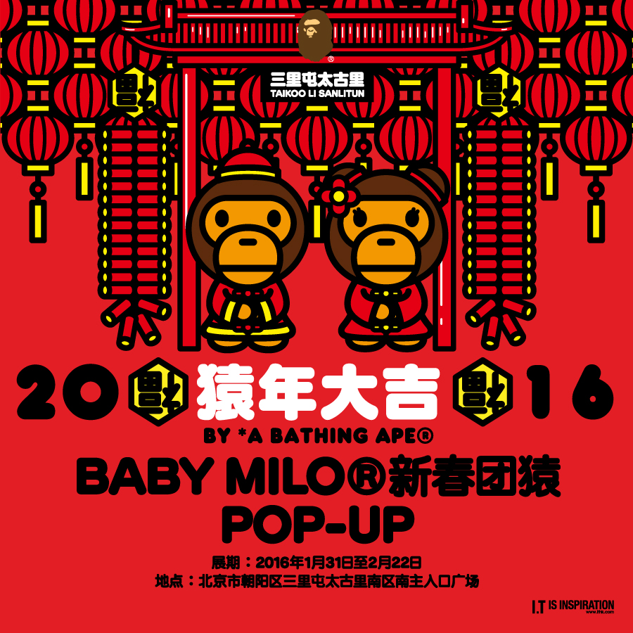 伴随巨型 BABY MILO® 装置登场,A BATHING APE® 也将在北京三里屯 BAPE STORE® 推出相应的特别活动。在三里屯太古里的 BABY MILO® 展出期间,只要与该装置合影并发送照片至 BAPE® 官方微信账号(bape_official),即可前往三里屯太古里 BAPE STORE® 免费领取品牌猿年大吉限定贴纸一张;最有创意的 10 位猿人迷,更可获赠 BABY MILO® 特别版 TOTE BAG。而在 BAPE STORE® 全国范围门店消费满 3000 元人民币,即可获赠利是封一包。
