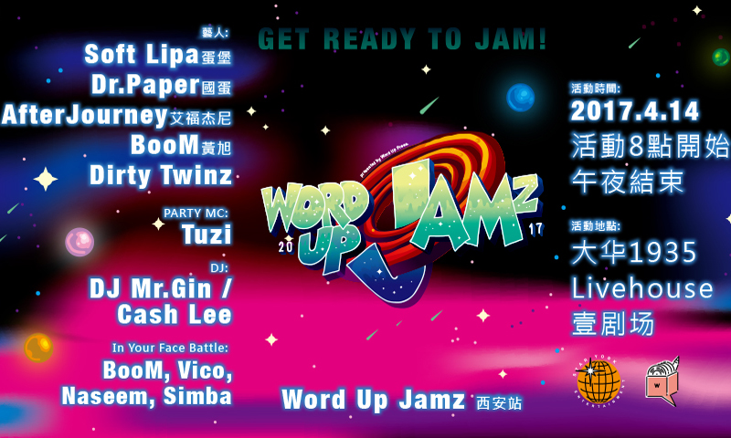 国内最炙手可热的 Hip Hop 演出阵容将来到古都西安。从 Old School 到 New Trap Shit,从 Westside G-Funk 到 Eastside Classical,你都能在这座拥有五千年底蕴的城市里寻找到任何一种你想要的风格。Word Up Jamz 2017 年巡演的第一站将混合千年文化与 Hip Hop 精髓带到西安。4 月 14 日,蛋堡 Softlipa、国蛋 Dr.Paper、艾福杰尼 AfterJourney、BooM 黄旭、Dirty Twinz 的演出将足够震撼。不用怀疑,Hip Hop 的西安,期待你的体验。现在起时刻关注 NOWRE 微博还有机会免费获得门票。