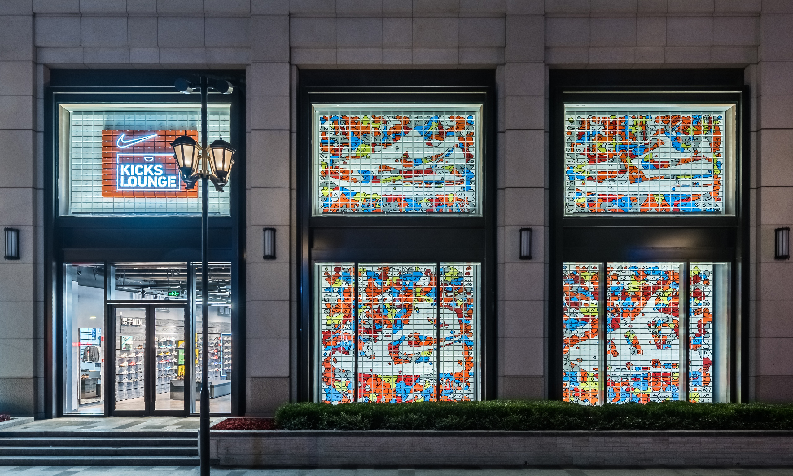 位于兴业太古汇的 Kicks Lounge 体验店为球鞋爱好者展现了全新的店铺概念,店铺门口四幅巨型的橱窗由艺术家 Jayson Atienza 精心设计,分别描绘了 Air Jordan I, Air Force 1, Air Max 1和 Air More Uptempo 四双耐克标志鞋款的形状,用别具一格的形式诠释了上海特色的街头文化。