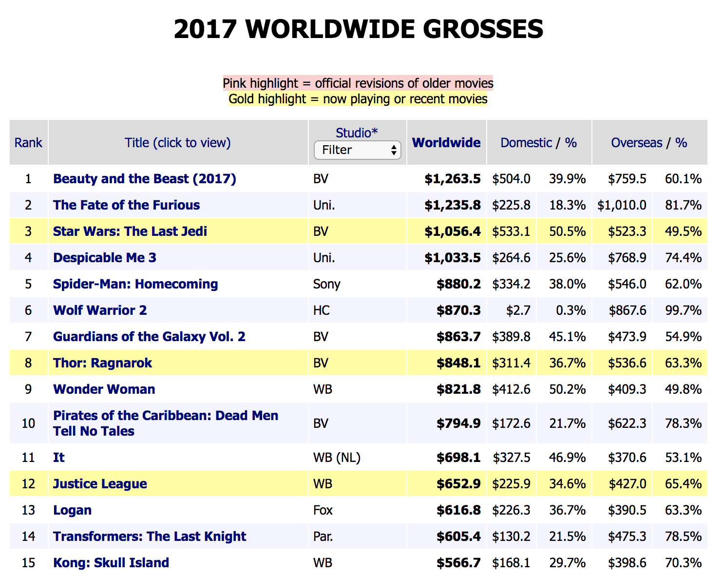 2017 已经彻底成为历史,在过去的一年中,全球电影总票房达到创纪录的 399 亿美元,不少优秀的电影也丰富了我们的生活。日前根据 Box Office Mojo 的统计,去年电影票房排行榜也正式公布。《美女与野兽》真人版毫无争议的以 12.63 亿美元拿下冠军,第二名则是《速度与激情 8》,票房也高达 12.35 亿美元,第三名则是《星球大战 8:最后的绝地武士》。值得一提的是中国电影《战狼 2》也以 8.7 亿美元的票房跻身第 6 位,成为唯一一部非好莱坞电影。具体排行榜详见下图,看看你为哪部电影贡献了一臂之力呢?