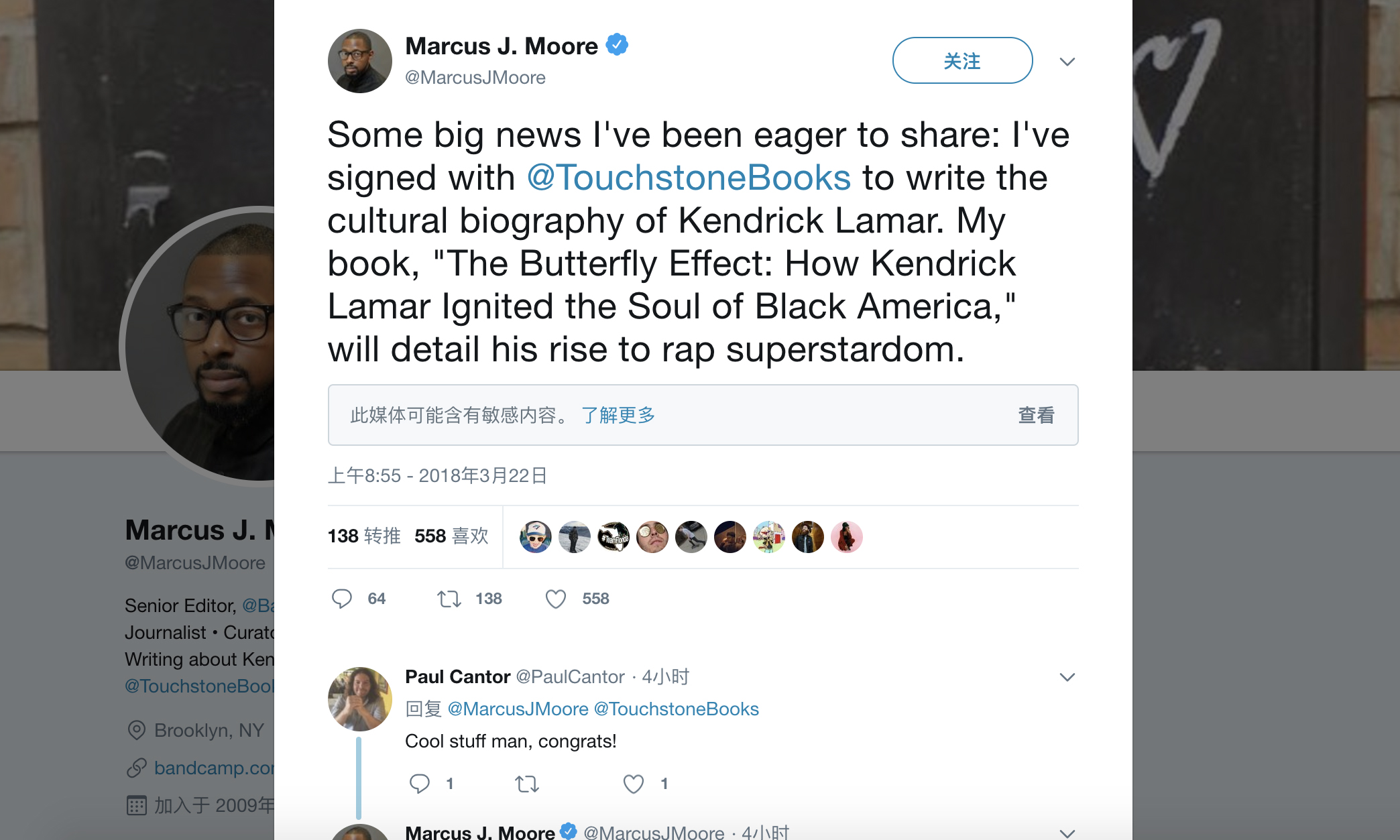 叫好又叫座的格莱美奖音乐人 Kendrick Lamar 即将拥有自己的传记书。Pitchwork 撰稿人、Bandcamp 高级编辑 Marcus J. Moore 近日在自己的 Twitter 上发布了这一消息。这本书由他执笔,名为《The Butterfly Effect: How Kendrick Lamar Ignited the Soul of Black America》(蝴蝶效应:Kendrick Lamar 如何点燃美国黑人的灵魂),并将通过 Touchstone 出版,该出版社曾出版过 Paul McCartney、Joey Ramone、Bruce Springsteen 等人的传记。这本书应该能提供更多维度的观点,喜欢 Lamar 的朋友不妨多加留意。