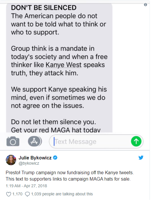 在早前 Kanye West 在 Twitter 上疯狂支持 Donald Trump 并佩戴竞选帽子之后,不知道是故意设计的还是缘分就是这么到位,川普的竞选团队将侃爷作为竞选工具在社交网络上狠狠拉票并卖帽子。川普的团队向支持者们发送了一条短信,表示:“不能再沉默下去了,美国人民不应该由别人告诉他们该去支持谁或者去思考什么。而当下这个从众思考的社会,一旦有 Kanye West 这样独立思考的异见者出现就会群起而攻之。我们应该去支持 Kanye 说出他的想法就算别人不同意他。别让他们阻止你说出你的想法,现在就去购买这顶 ‘Make America Great Again’ 帽子吧!”