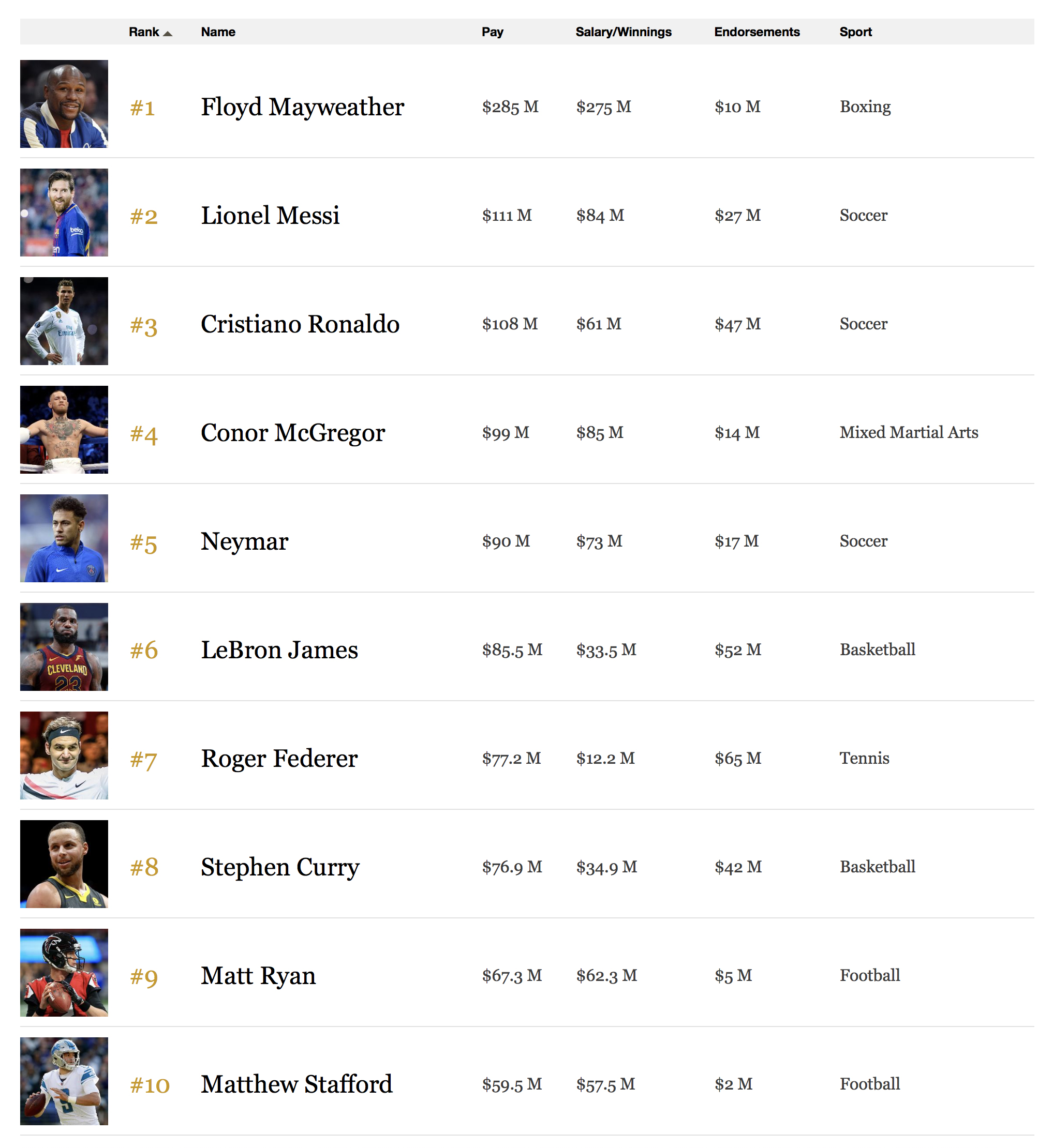 福布斯刚刚发布了 2018 年最高收入运动员的年度榜单,拳击手 Floyd Mayweather 凭借 2.85 亿美元的总收入位居榜首 (尽管去年他连前十都没够到,今年能够 “龙门一跃” 也是因为在与 Conor McGregor 的 “世纪之战” 中胜出)。球星 Lionel Messi 以 1.11 亿美元位列第二,另一位足球明星 Cristiano Ronaldo 则紧随其后 (C罗在去年位列该榜单第一)。前十名的运动员及收入如下,如果你有兴趣的话还可以在此查看更详尽的榜单。