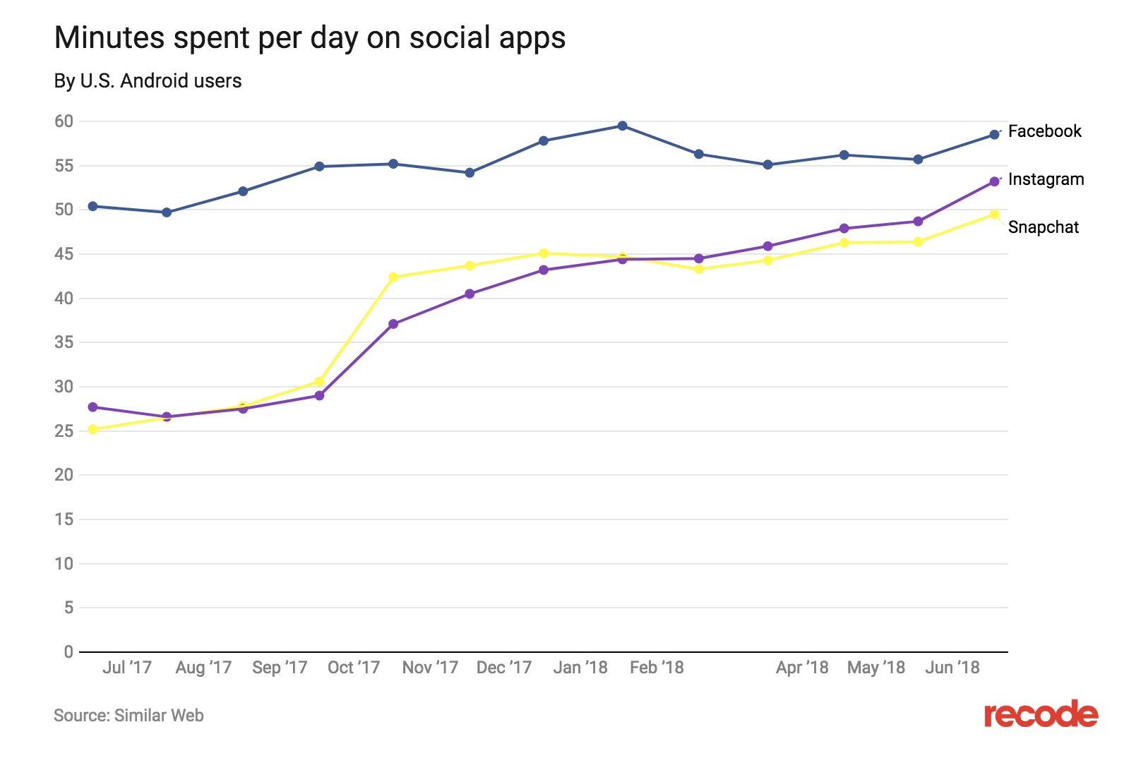 根据 Similar Web 公司的新数据,美国 Instagram 用户每天在应用上花费的时间达到了 53 分钟,仅比 58 分钟的 Facebook 少了五分钟,而另一热门应用 Snapchat 则是 49.5 分钟。除此之外 Recode 还制作了一份从去年 7 月到今年 6 月用户在这三个社交平台上用时的走势图,很明显能看到,在这一年里这三家的用户参与度都有增长。而这仅仅只是来自三个社交平台的数据,在国内更有微博、抖音等等 App 占据着我们每日的生活。社交平台固然有趣,但大家还是要适度使用啊。