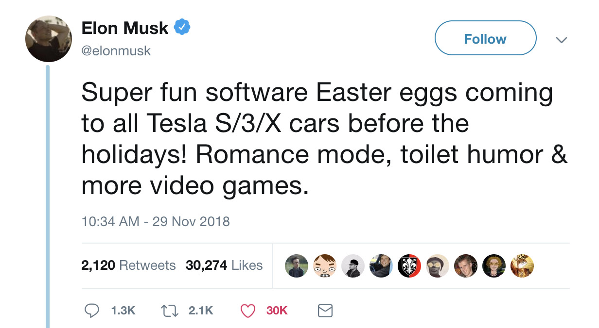 手头的科技产品只要有新系统发布,大家都会第一时间升级感受。作为科技驾驶的领军企业,特斯拉也将迎来相当有趣的改变。今天 Elon Musk 在 Twitter 宣布支持 Tesla S/3/X 的全新车载系统升级即将在假日到来之前发布,包括浪漫模式、厕所笑话等,甚至还能打游戏。随即有网友调侃是否支持马里奥赛车,Musk 还亲自回复任天堂没有给特斯拉授权。虽然不知道新系统可以玩什么游戏,但是对特斯拉车主来说已经非常值得期待了。不过驾车时千万不要玩,安全行驶最重要。