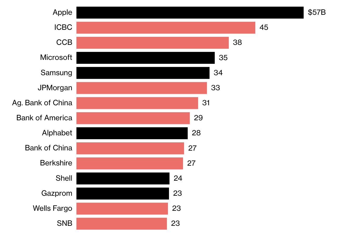 今日彭博社公布了过去 1 年中最赚钱公司排行榜,苹果公司以 572 亿美元冠绝全球,连续 4 年蝉联冠军,国有四大行:工商银行、建设银行、农业银行和中国银行分别位列第 2、3、7、10 位。从下图榜单中可以看出,排名前 10 当中均为银行和科技公司,这也是制药公司与汽车公司 8 年来首次未进前 15。苹果公司一年来虽然饱受非议,大幅调整产品售价,但从成绩来看,还是相当坚挺的。
