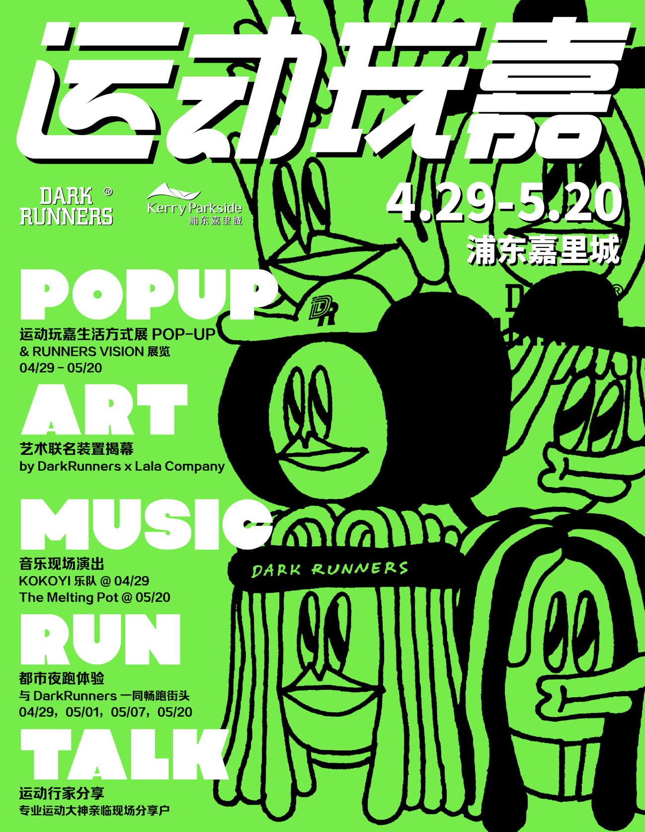 活动从 4 月 29 日至 5 月 20 日,除了 DarkRunners 的城市路跑体验以外,还有各类新潮运动等你加入,如骑行,匹克球,乒乓,瑜伽,龙舟赛艇等…