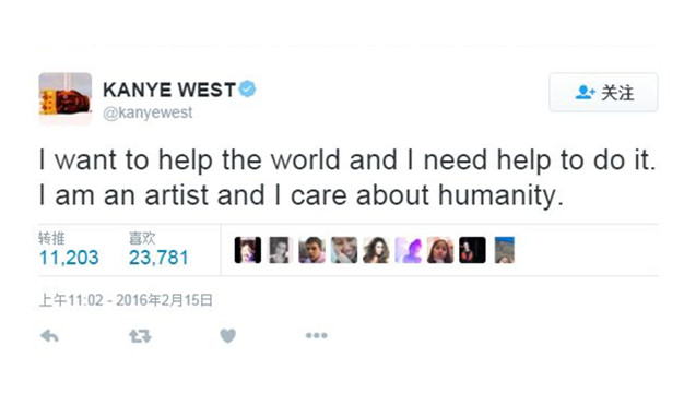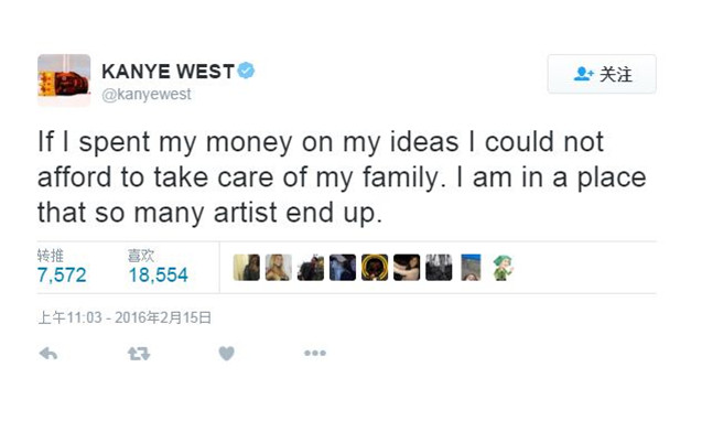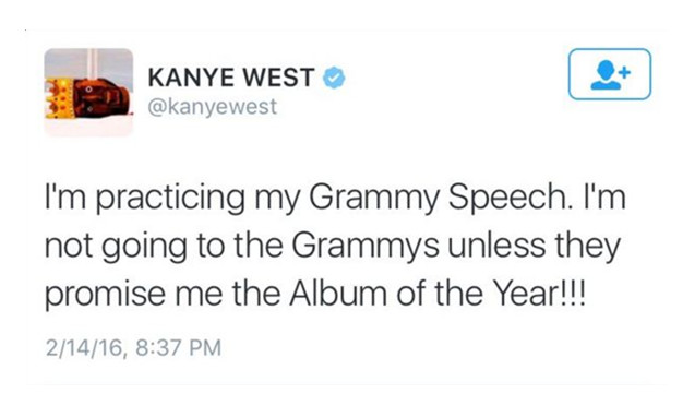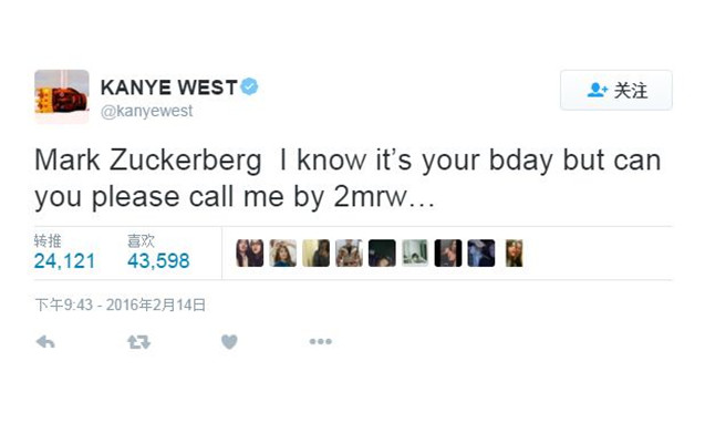一向狂妄自大的 Kanye West 突然向 Facebook CEO Mark Zuckerberg 寻求帮助原来是因为现在负债五千万。他希望 Mark 能为他的想法投资 10 亿美元,简单来说就是 Kanye 觉得仅凭一己之力无法满足自己的“济世情怀”,希望 Mark 帮助他令这个世界更美好……不过就在 Mark 那边还没还未做出回应的时候,这边 Kanye 又开始口出狂言了。对于今早的格林美颁奖礼,Kanye 先是抨击说评审存在偏见,甚至更将自己比作是音乐界的 Michael Jordan 或 Stephen Curry。意气风发的 Kanye 更自大的说自己正在练习获奖感言,如果明年格莱美不把年度专辑给他的话,他就不去了。