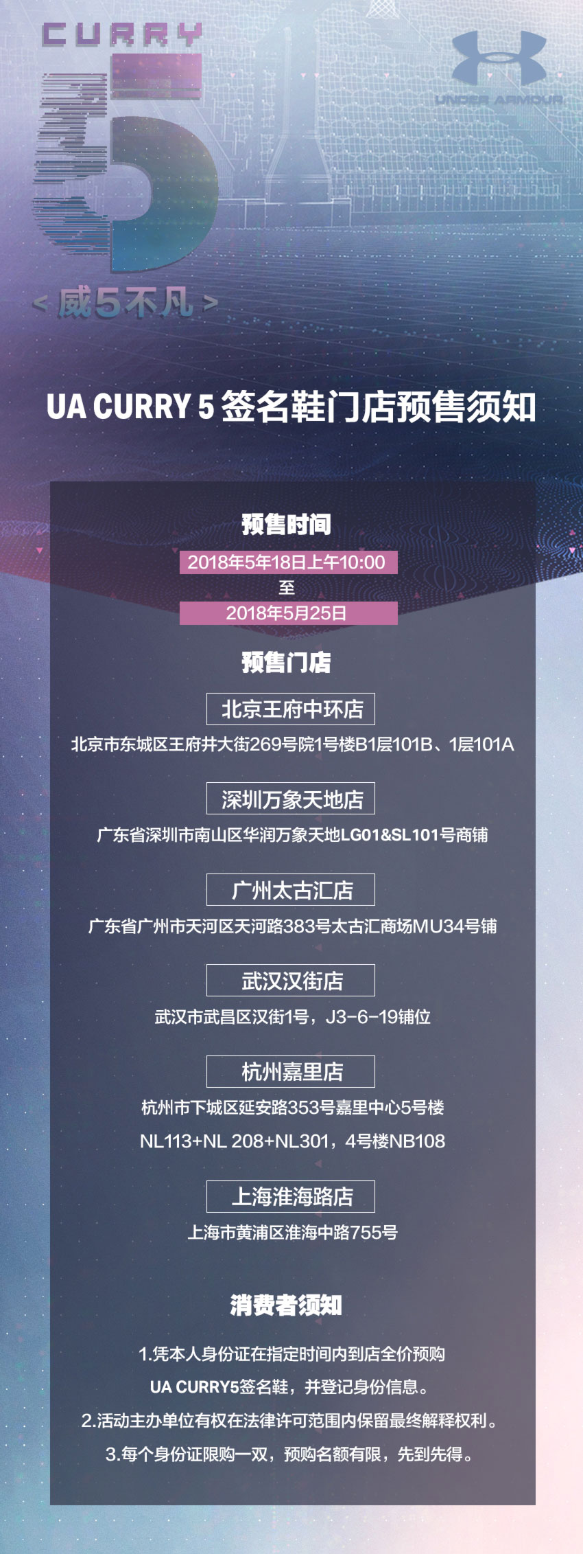 NBA 季后赛如火如荼,西部决赛也是火星撞地球般的精彩,其中勇士队当家后卫史蒂芬·库里脚下的新款战靴 Under Armour Curry 5 也吸引了无数库密们的心头好。原本还在等待发售日期,没想到今天 Under Armour 提前带来惊喜,无预警发布预售信息。目前大家可以通过 UA 官方商城、UA 天猫旗舰店以及 UA 京东旗舰店在线上进行预购,门店预售详情不妨参考下图。