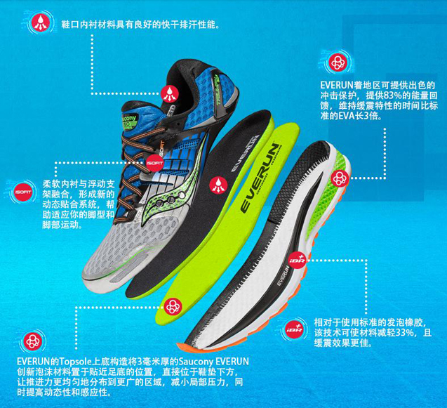 Saucony 在 2016 年全新推出了品牌最先进的 EVERUN™ 持久缓震科技。它可以保持缓震特性 3 倍时长于普通 EVA,同时也让跑者的每一步都获得高达 83% 的能量回馈。EVERUN™ 拥有特殊的 Topsole 上底构造,将 3 mm 的 EVERUN™ 泡沫放在更贴近足底的位置,直接位于鞋垫下方,而不仅仅镶嵌于中底内,这样将实现足跟平稳触地并减少前足所受的压力。目前拥有该超强持久缓震的跑鞋有 Triumph ISO 2、Hurricane ISO2、Guide 9、Kinvara 7 和 Peregrine 6,现已在 Saucony 各指定专柜发售。