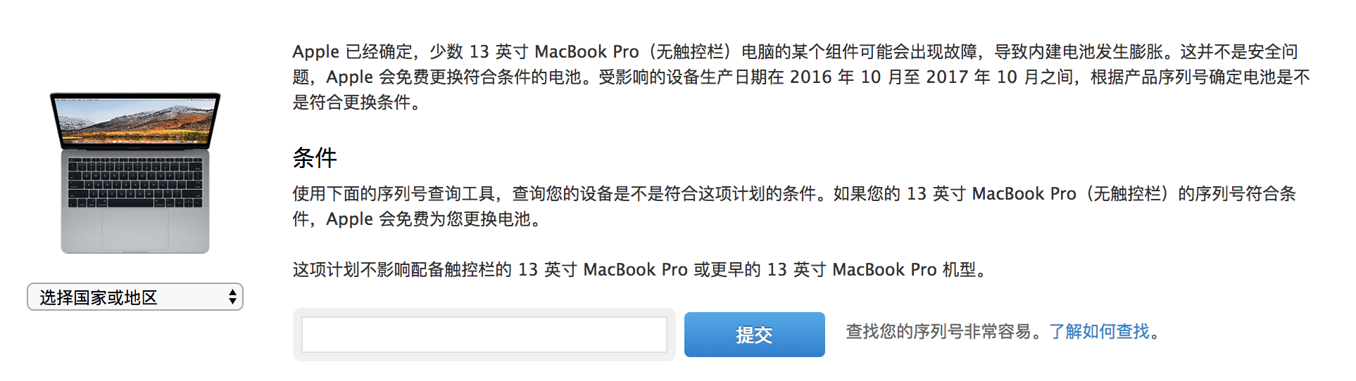拥有 13 英寸 MacBook Pro(无触控栏)电脑的用户们注意啦,Apple 不久前确认了部分在 2016 年 10 月至 2017 年 10 月之间生产的 13 英寸 MacBook Pro 的某个组件可能会出现故障,导致内建电池发生膨胀。不过这并不是安全问题,而且 Apple 会免费更换符合条件的电池。使用者可以在此进入相关界面,输入机身序列号查询自己的机子是否受此影响。如果符合更换条件的话,便可选择 Apple 授权服务提供商或去往 Apple Store 零售店 享受更换服务。这项计划不影响配备触控栏的 13 英寸 MacBook Pro 或更早的 13 英寸 MacBook Pro 机型,另外在检修之前,也别忘了备份数据。