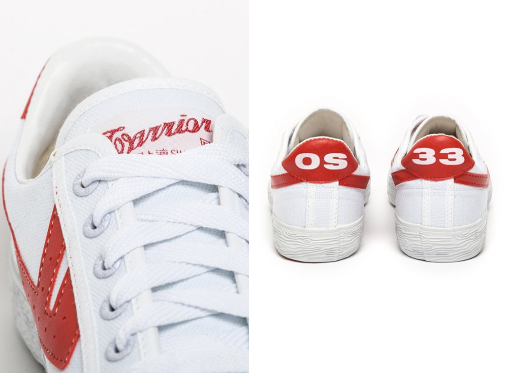 虽然 WOS33 目前仅有一个款式(两种配色)上架,均以回力经典的白底 Logo 款式为蓝本,将鞋舌标和后跟标上的 “回力” 换成翻译版 “WOS33” 以及 “Warrior” 字样,鞋头部分稍做改动,看来是要以经典款打开国外市场。