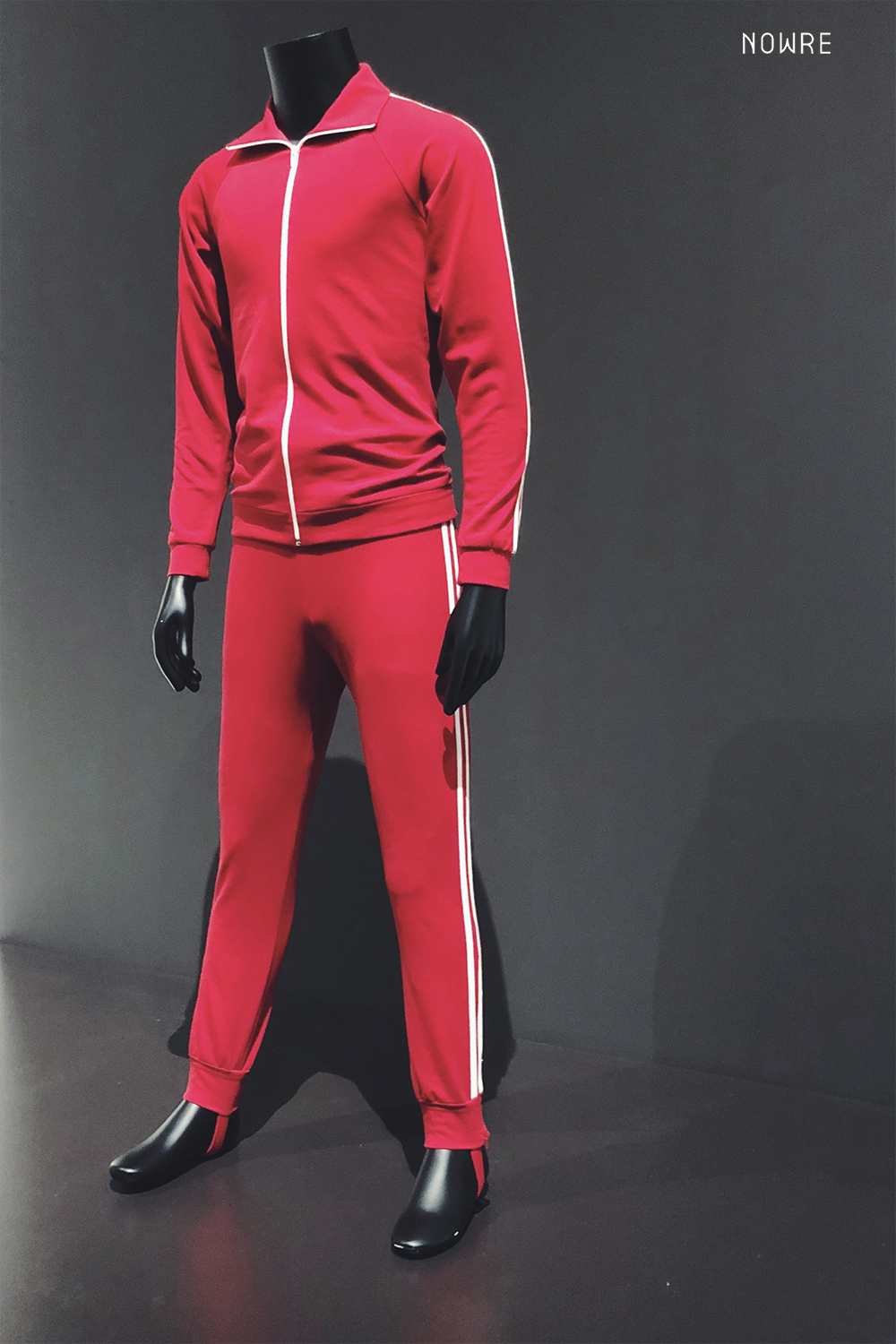 从上世纪 70 年代开始,Tracksuit 开始与时尚紧密相连。这种 “行头” 能成为流行也与当时功夫电影以及像李小龙这样的动作影星的崛起有关。MoMA 展出的这件红色运动套装,原型就是李小龙 1971 年在影片《盲人追凶》里的戏服。仔细看的话,能见到裤脚底下有一个用来固定的带子,两边还有方便穿脱的拉链。这种设定,在现在的大多数 Tracksuit 上依旧能够找到。
