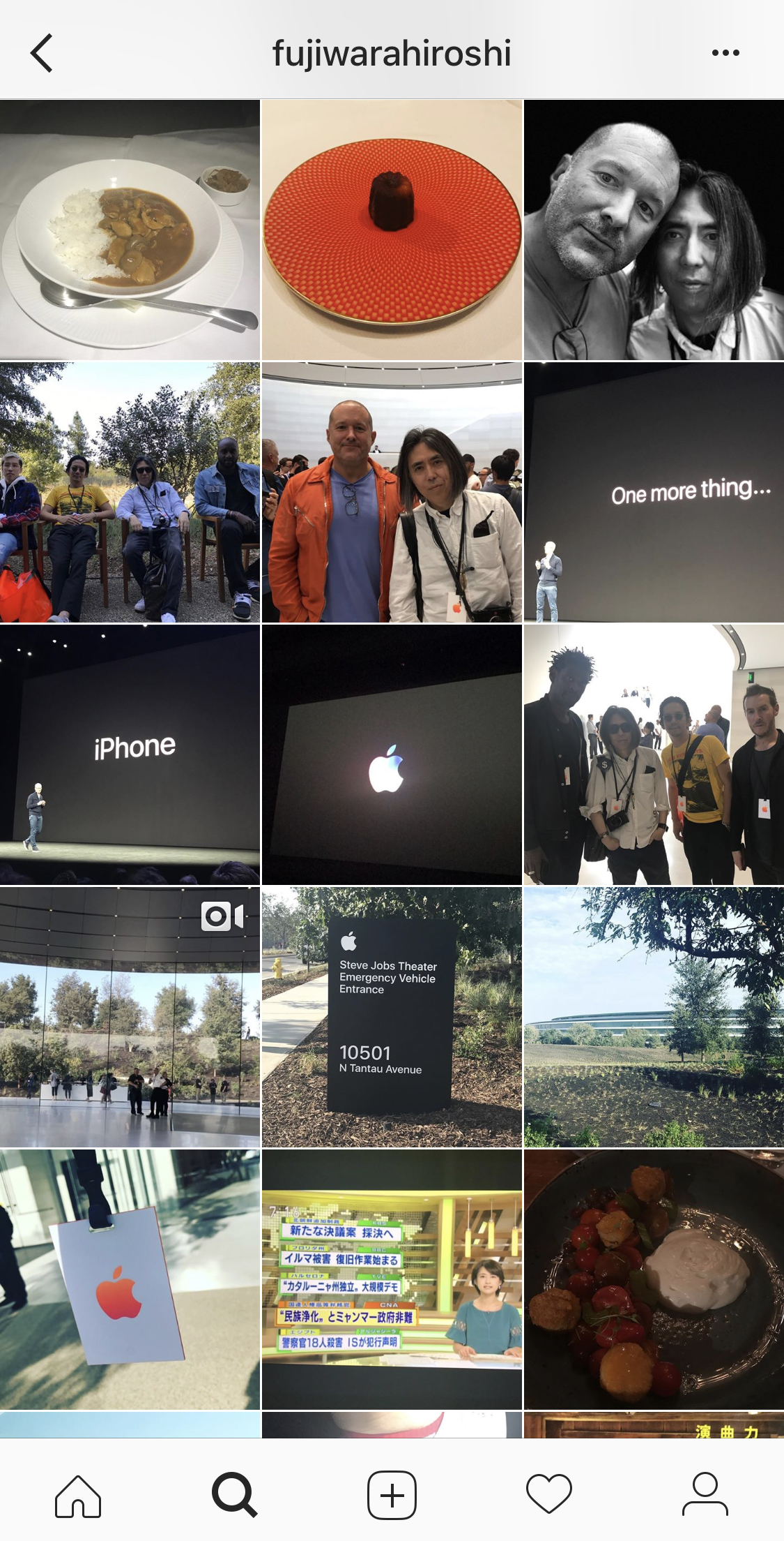 上面提到了 fragment design 推出的 Apple Watch 表带,实际上,藤原浩与苹果之间的渊源一直很深。2017 年的苹果发布会,藤原浩受邀参加,并且还一同参观了苹果刚刚建成的总部,当时,教父本人在自己的社交平台上刷屏般的分享了许多照片,另外还在 Ring of Colour 上发布了一篇关于 iPhone X 的体验报告。