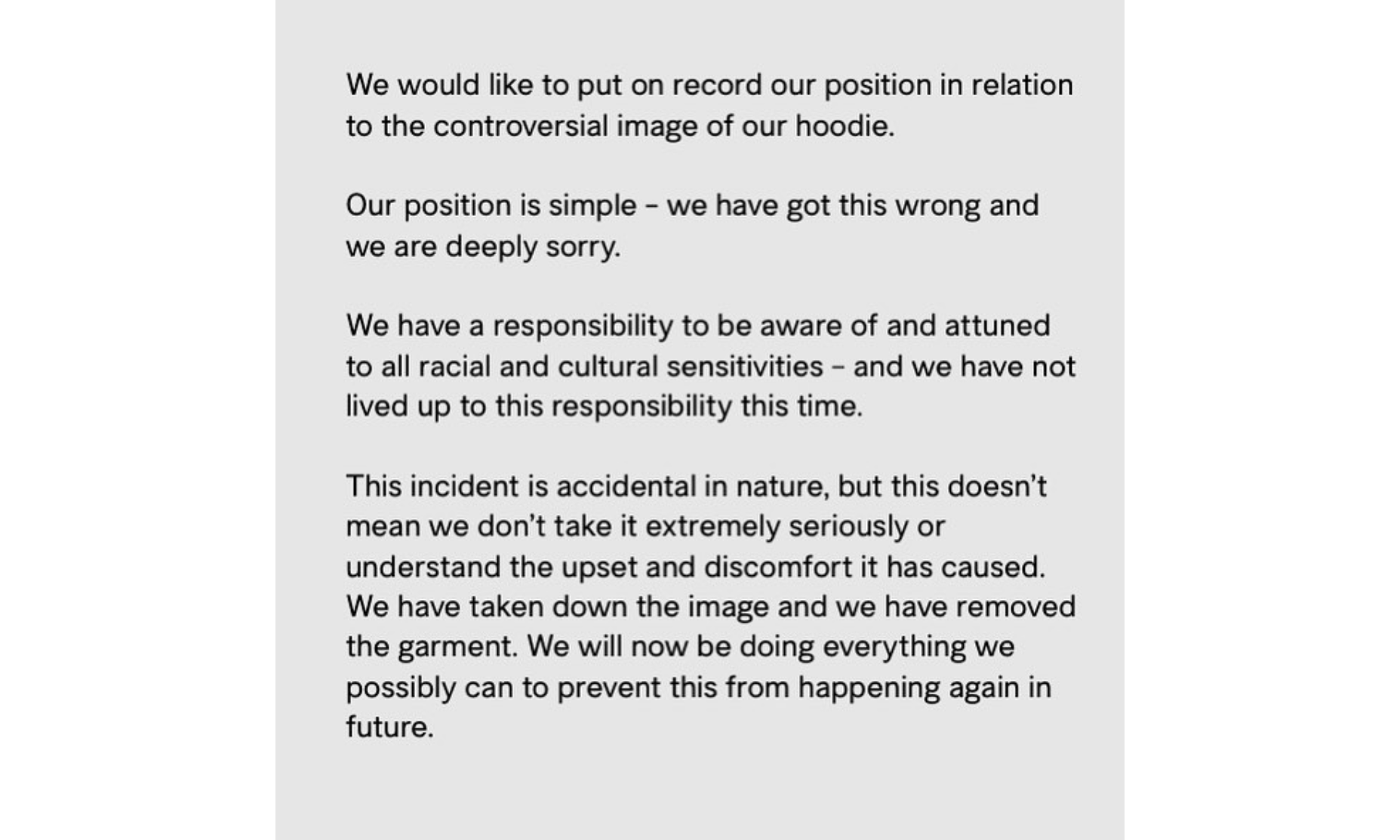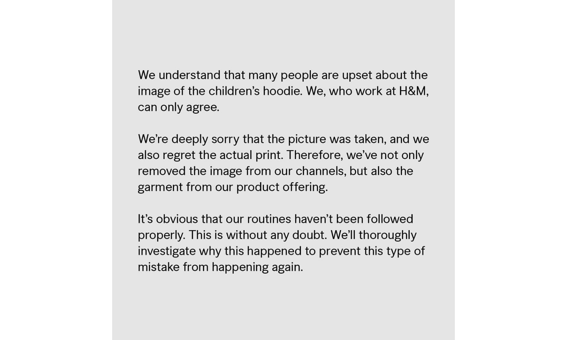 这则道歉声明的内容很简单,总结起来大致为三部分:“我们理解群众的这种感情,也有责任意识到这样的做法会牵扯到种族话题的敏感性,然而我们这次并没有承担好这个责任”,“这次的帽衫事件是个意外,我们已经在所有网站上撤下了这条广告,并且尽一切可能防止这样的情况再次发生”,“我们错了,对大家表示深刻的歉意”。