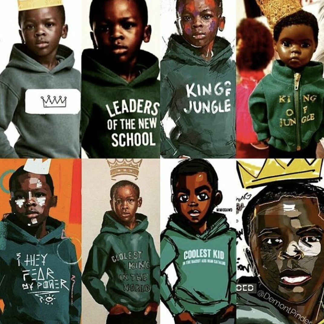 乍一看挺正常的,但写着 “COOLEST MONKEY IN THE JUNGLE(丛林中最酷的猴子)” 标语的帽衫加上黑人小模特的设定,问题一下就显现出来了…要知道,“猴子”这一称呼在西方世界可是一种流传甚广的对黑人种族的侮辱,带有这样标语的一件帽衫交给一个黑人小孩来演绎,的确很容易会让人感到不舒服,不过,H&M 当然也可以辩解称这只是个巧合,但…在有着强烈对比的情况下,就不会这么容易了事了: