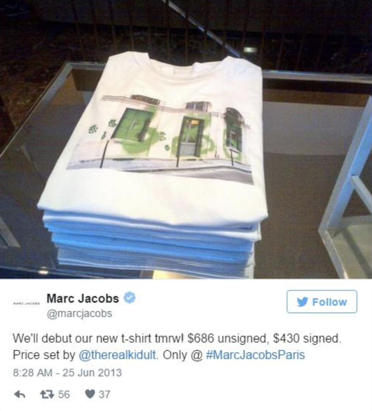 为了进行反击,Kidult 同样设计了一款 T-Shirt,取名为 “Not Art By Kidult”,但售价却仅仅为 $10 美元。而在之后的一年,Kidult 又再次袭击了 Marc Jacobs 的门店,在墙面喷上了 “686” 和美金符号的图案,并在自己的社交账号上发布了一条内容: