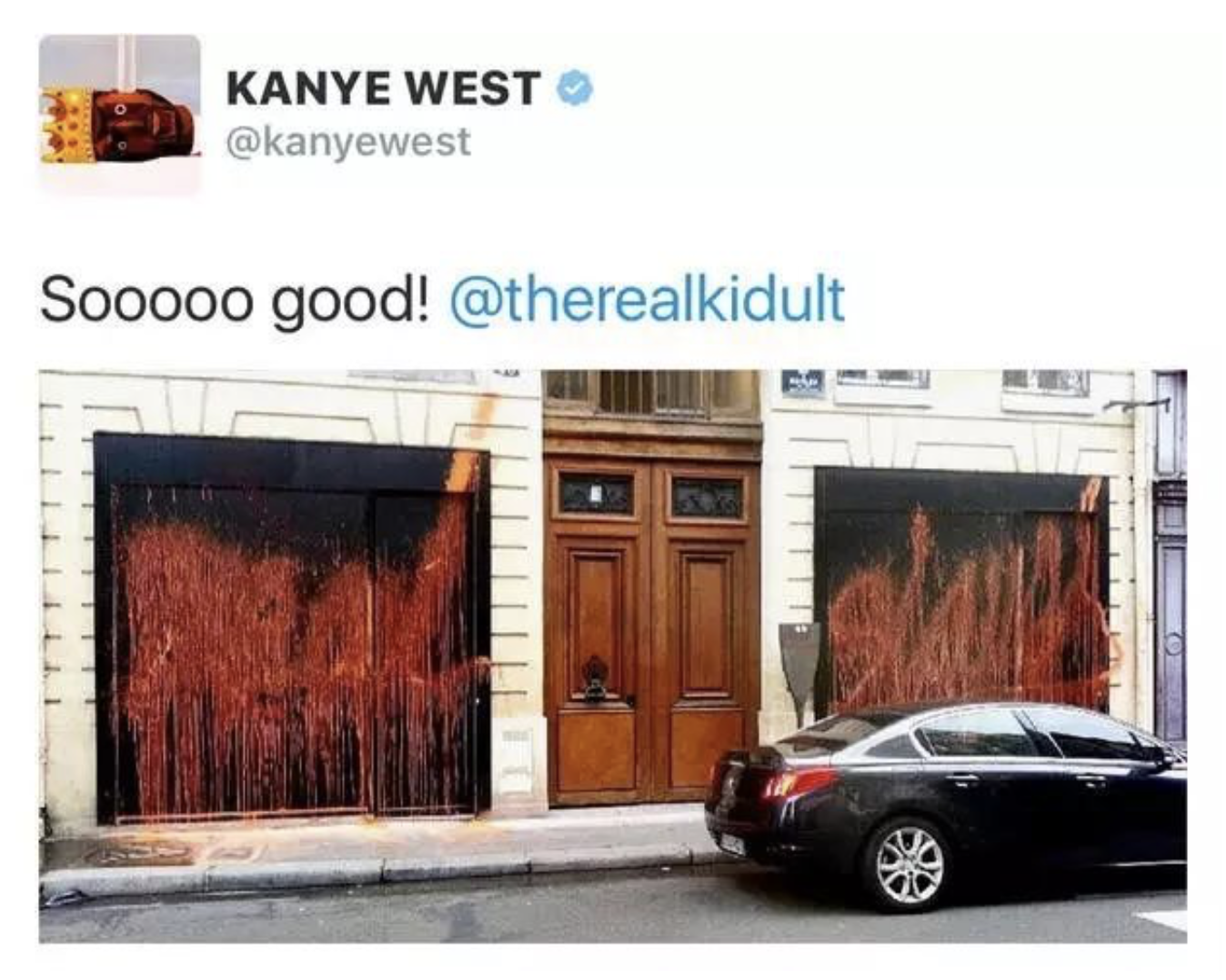 Kanye West 在自己的 Pablo Pop Up 店铺被袭击后,不但不生气,还在自己的社交账号上为 Kidult 点了赞。