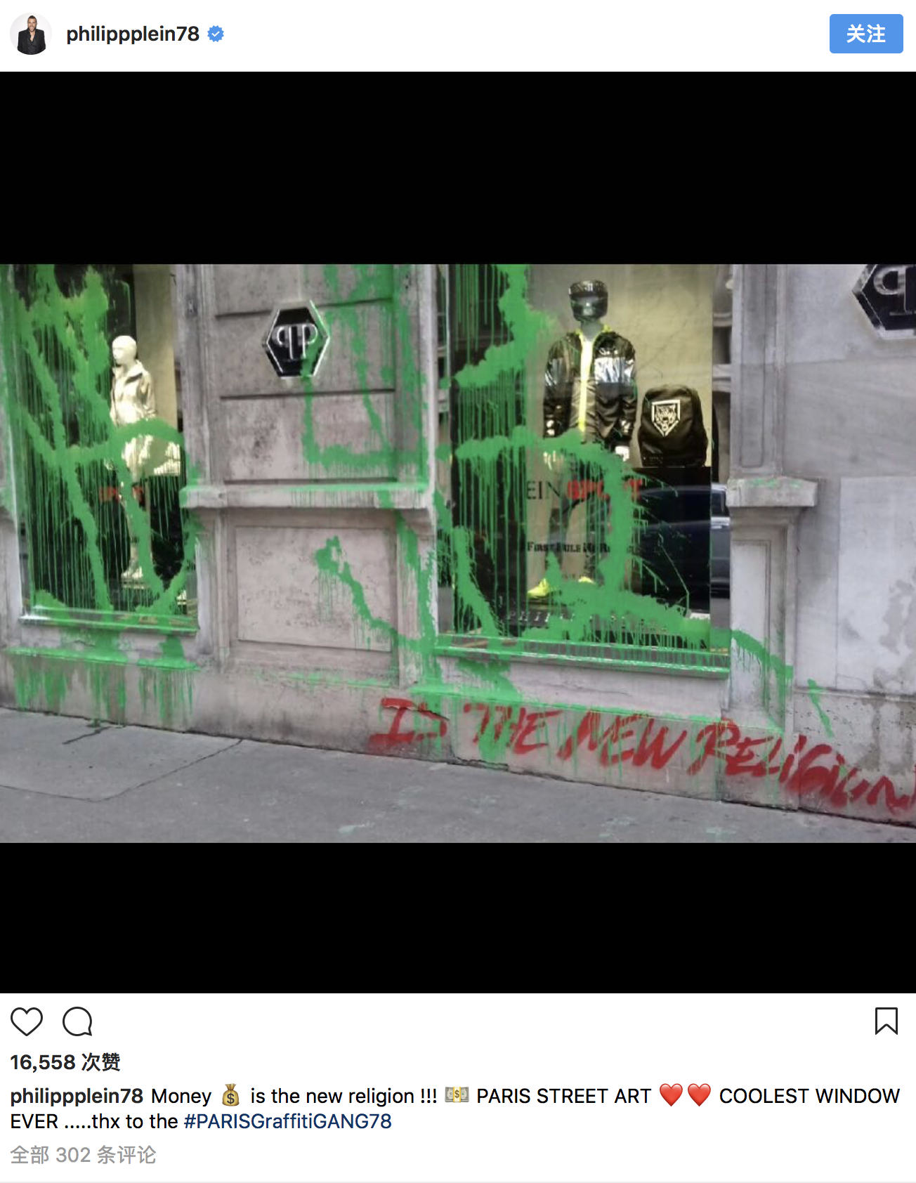 最近一次被 Kidult 攻击的 Philipp Plein 也同样如此,因品牌此前与涂鸦艺术家 Alec Monopoly 的合作,双方 “$ is the new religion” 的口号惹怒了 Kidult,相应地 Kidult 用他签名般的杂乱涂鸦方式在 Philipp Plein 店外及橱窗上喷涂上了巨大的美元标志以示讽刺,意外的是,Philipp Plein 也并没有愤怒,相反还主动在 Instagram 上 Po 出照片表达对 Kidult 艺术的欣赏和感谢。