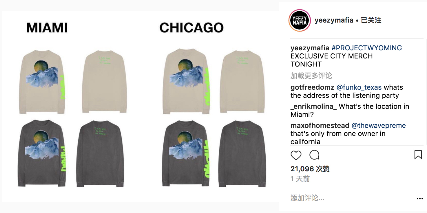 而就在前两天,情报账号 @yeezymafia 还曝光《ye》Merch 新增的迈阿密和芝加哥城市限定版,整个系列命名为 Project Wyoming,伴随着新专辑的派台,看来紧接着也会有一系列城市活动和限定周边推出,这十分类似之前《Life of Pablo》的操作,想必届时又将是一波抢购了。