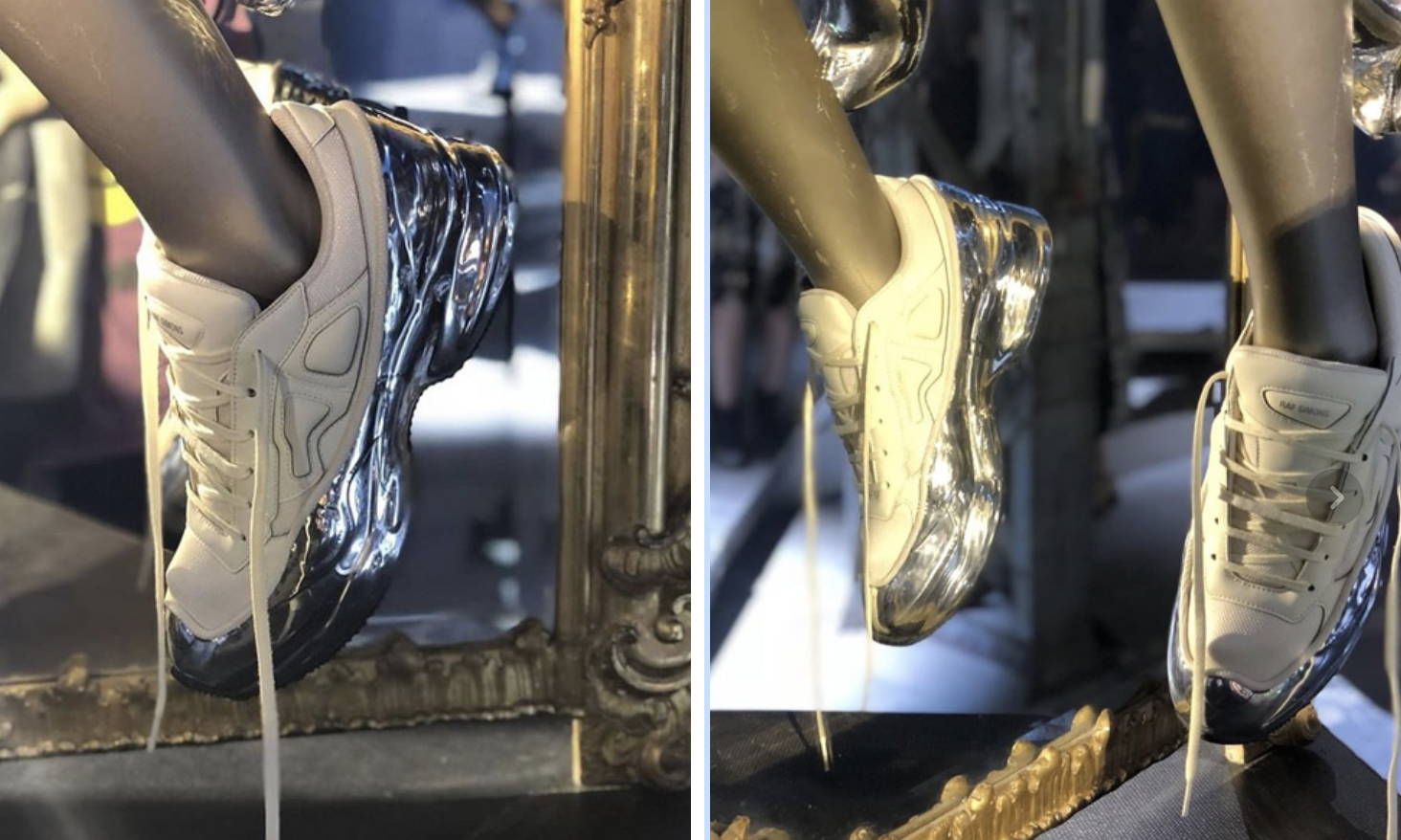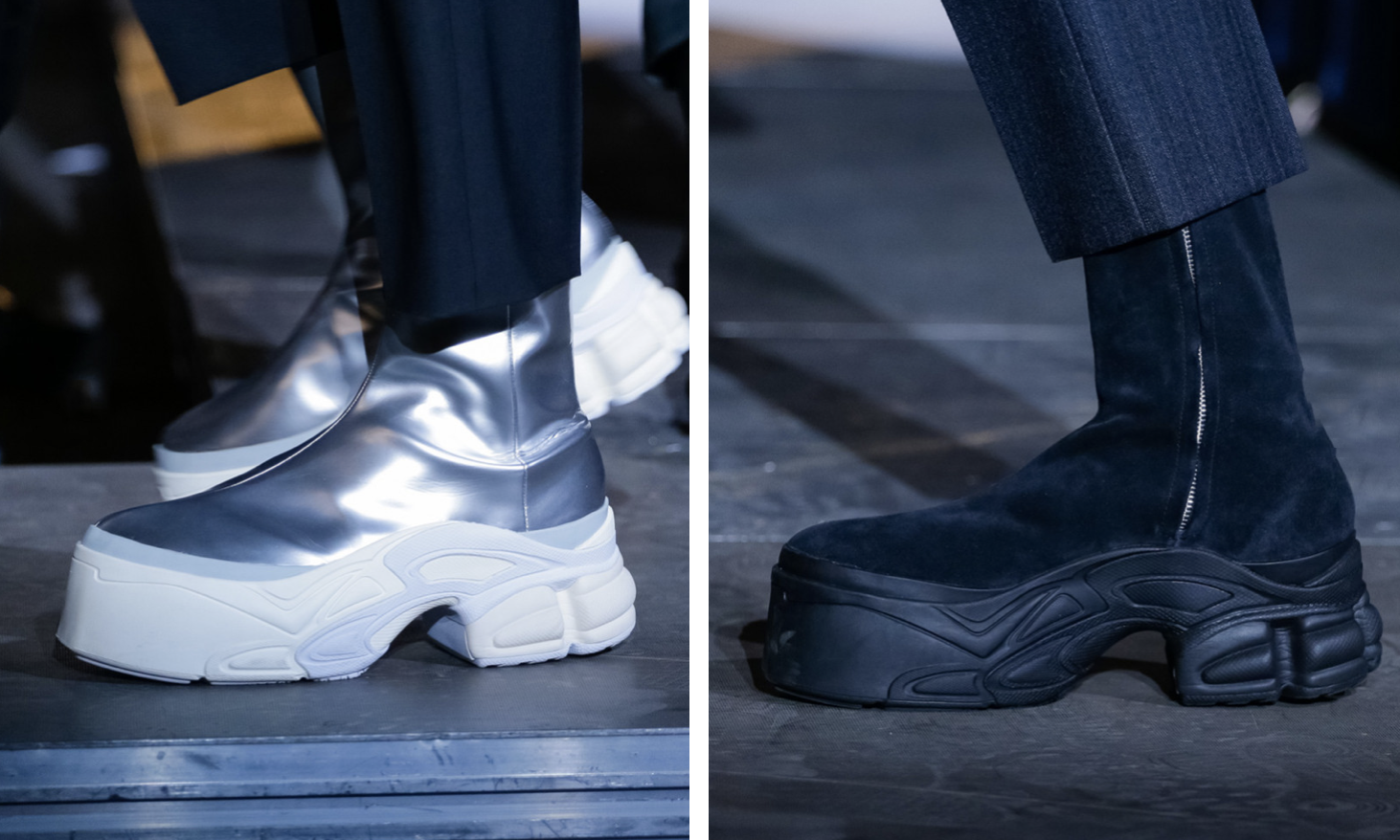 在最新的 19 春夏系列中,Raf Simons 延续着与 adidas 的合作,带来了两款新设计。其中的 Ozweego 大家应该很熟悉了,银铬鞋底所带来的金属感设计为这双老爹鞋增添了一丝未来感。而另外一双厚底、高帮的靴形设计其实是从 70 年代的 Platform Leather Boots 上汲取的灵感,鞋底则结合了 Ozweego 和 Detroit Runner。