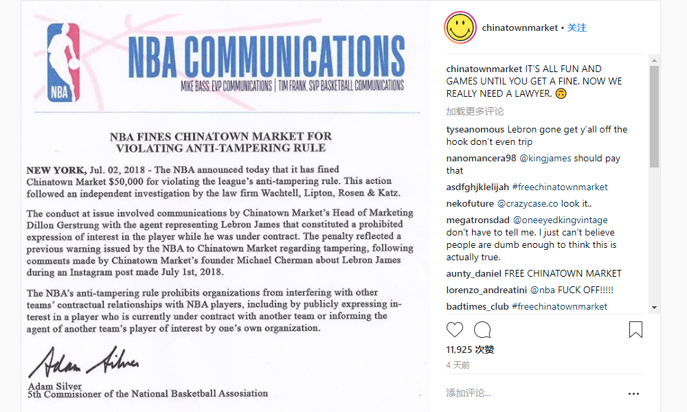 一开始很多人以为是由于 LeBron 违反了联盟在场馆内的一些着装要求,因此才收到了罚单。在这张 Instagram 的 Post 里,很多网民便建议 Chinatown Market 不妨将罚单交给 LeBron ,毕竟 50,000 美元对他来说可能就是打个喷嚏的事情。